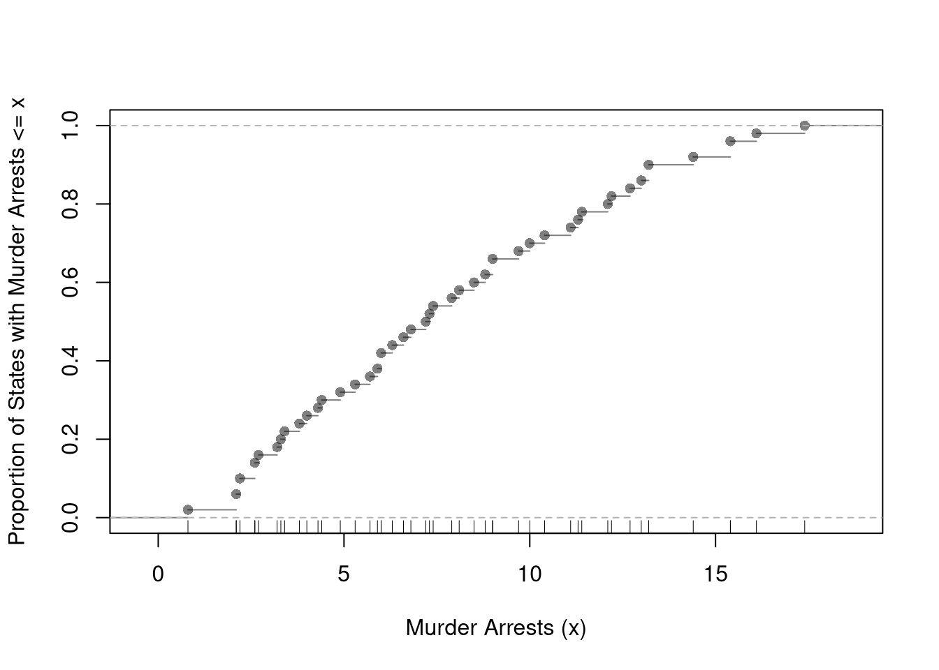 F_murder <-ecdf(USArrests[,'Murder'])# proportion of murders <= 10F_murder(10)## [1] 0.7# proportion of murders <= x, for all xplot(F_murder, main='', xlab='Murder Arrests (x)',ylab='Proportion of States with Murder Arrests <= x',pch=16, col=grey(0,.5))rug(USArrests[,'Murder'])
