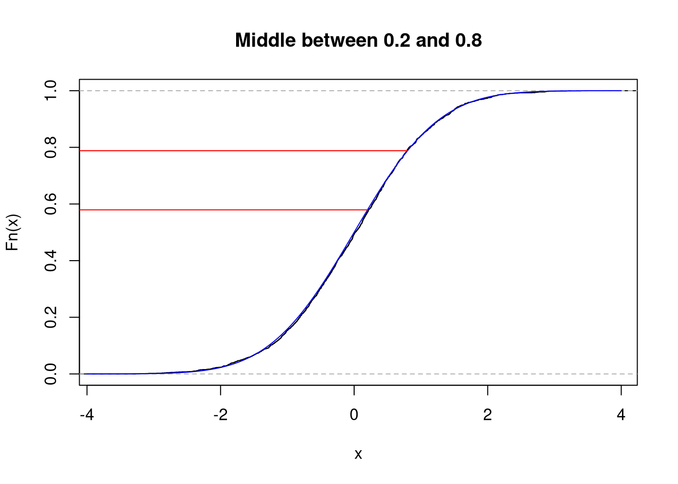 The probability of a value in \((0.25,0.75]\) is \(Prob(0.25 < X_{i} \leq 0.75) = Prob(X_{i} \leq 0.75) - \left[ 1- Prob(X_{i} \leq 0.25) \right] = 0.75 - 0.25 = 0.5\).