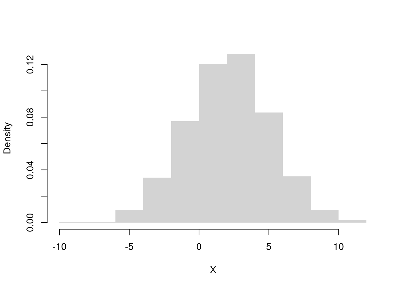 # Start with a simulation of 1000 people to build intuitionX <-rnorm(1000,2,3)hist(X, freq=F, border=NA, main=NA)