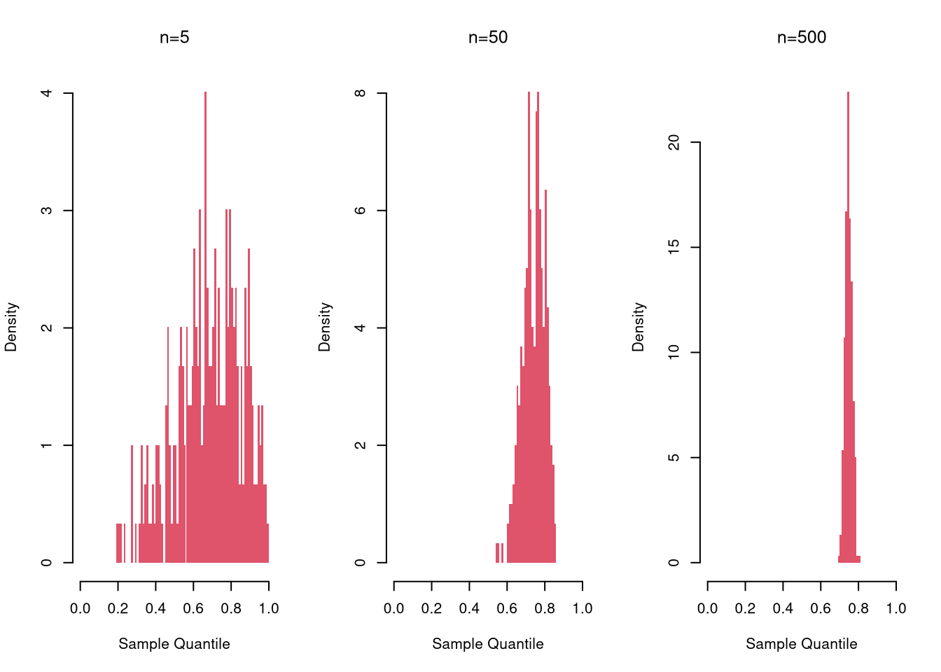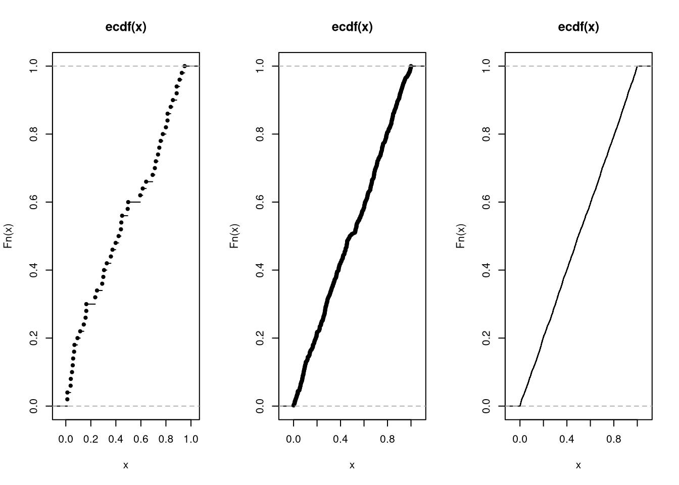 There are also several ways to computationally generate random variables from a probability distribution. Perhaps the most common one is “inverse sampling”. To generate a random variable using inverse sampling, first sample \(p\) from a uniform distribution and then find the associated quantile quantile function \(\hat{F}^{-1}(p)\).2