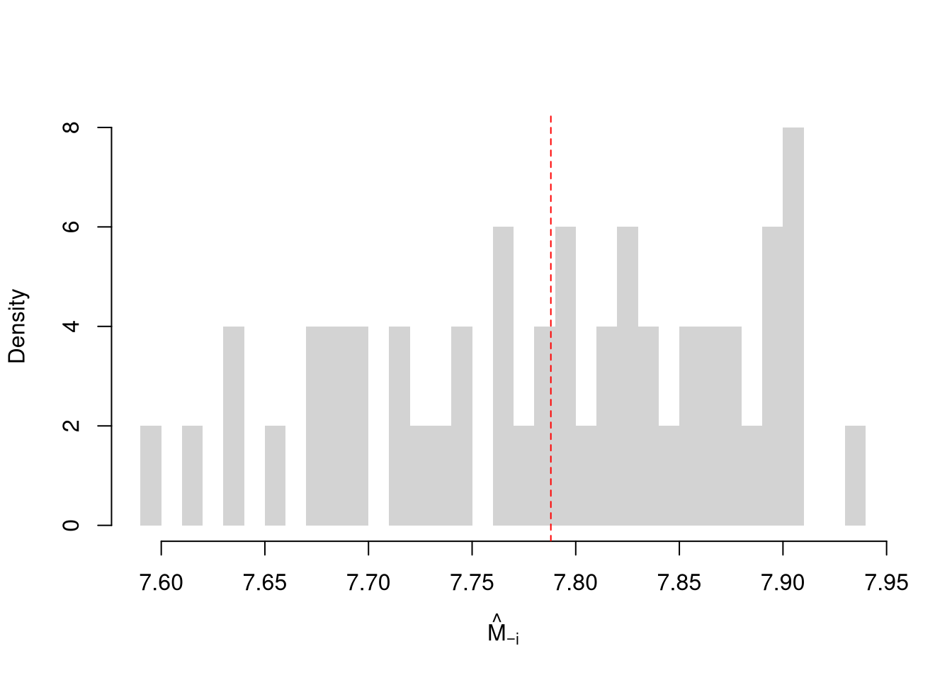 Here, we compute all “leave-one-out” estimates. Specifically, for a dataset with \(n\) observations, the jackknife uses \(n-1\) observations other than \(i\) for each unique subsample.