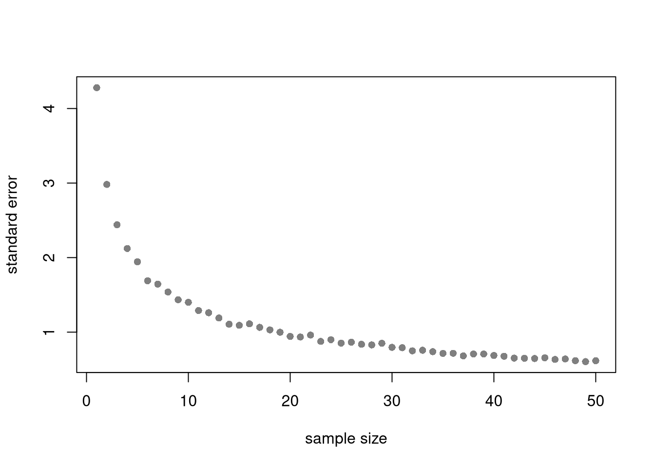 plot(Nseq, SE, pch=16, col=grey(0,.5),