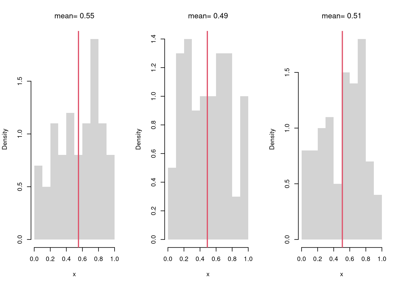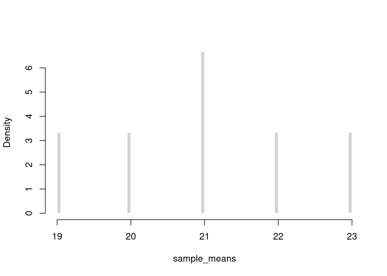 ## [1] 3 3Intuition for infinite populations: imagine drawing names from a giant urn. If the urn has only \(10\) names, then removing one name slightly changes the composition of the urn, and the probabilities shift for the next name you draw. Now imagine the urn has \(100\) billion names, so that removing one makes no noticeable difference. We can pretend the composition never changes: each draw is essentially identical and independent (iid). We can actually guarantee the names are iid by putting any names drawn back into the urn (sampling with replacement).