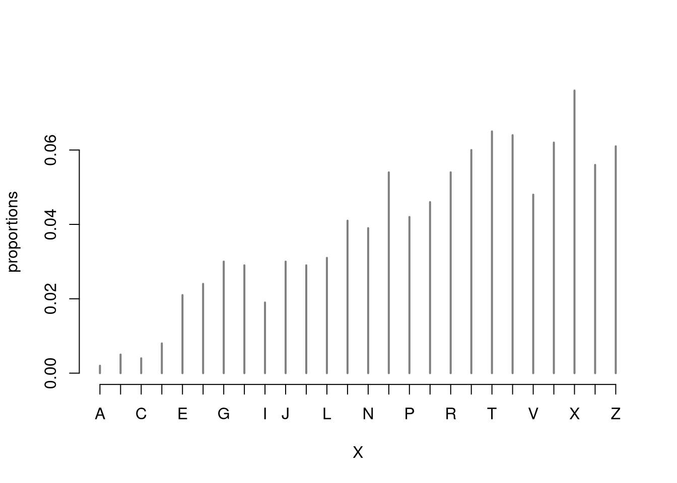 # Draw 3 Random Lettersx <- LETTERSx_probs <-1:length(x)x_probs <- x_probs/sum(x_probs) # probs must sum to 1X <-sample(x, 1, prob=x_probs, replace=T)X## [1] "V"# Draw Random Letters 100 TimesX <-sample(x, 1000, prob=x_probs, replace=T)X <-factor(unlist(X), levels=LETTERS, ordered=F)proportions <-table(X)/length(X)plot(proportions, col=grey(0,0.5))