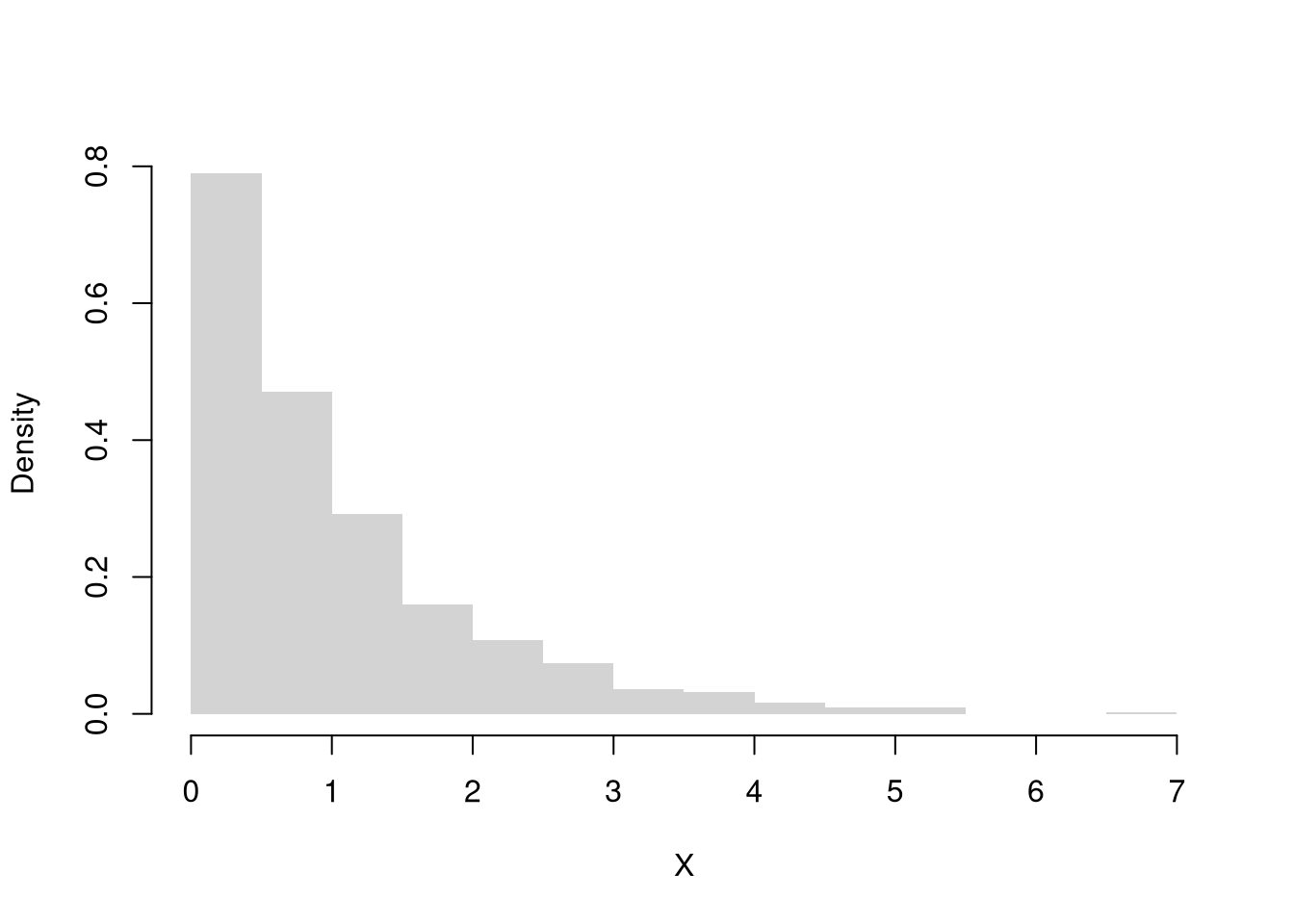 X <-rweibull(1000, shape=1)hist(X, border=NA, main=NA, freq=F, breaks=20)