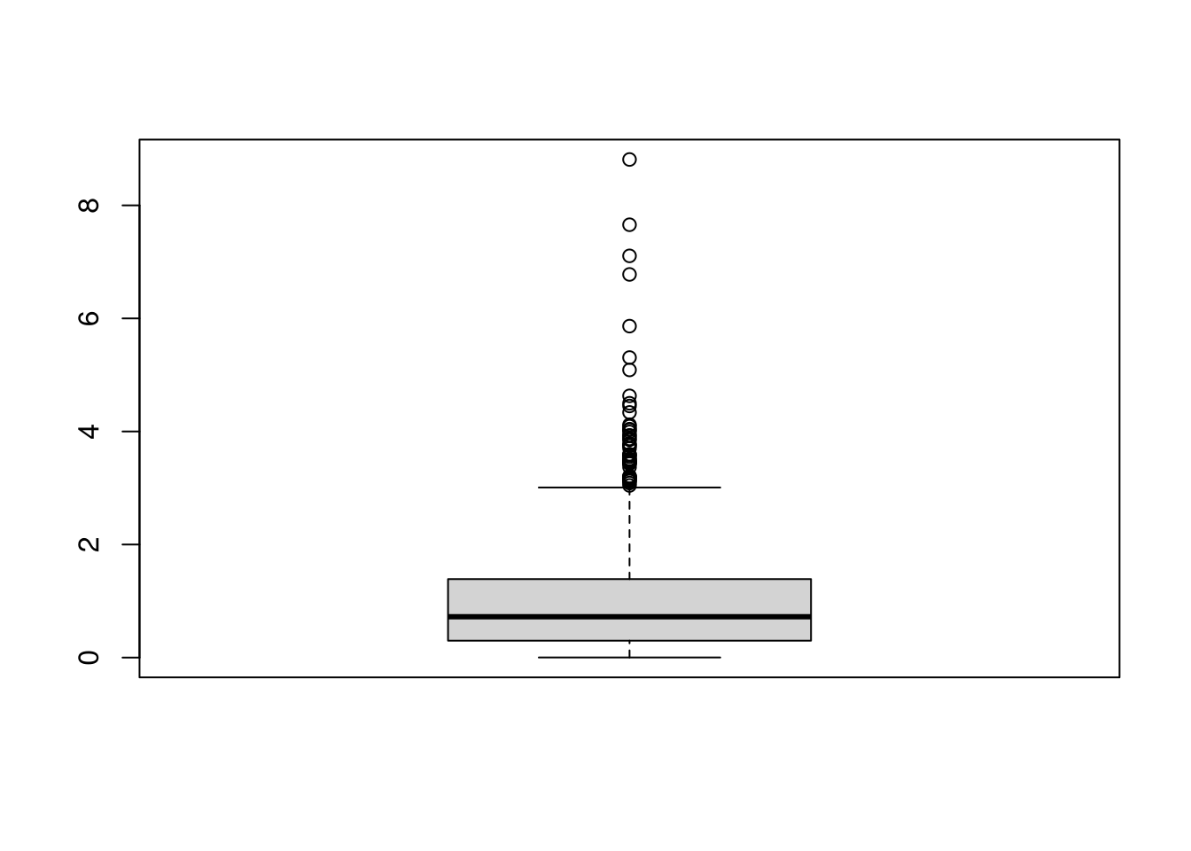 X <-rweibull(1000, shape=1)boxplot(X, main=NA)