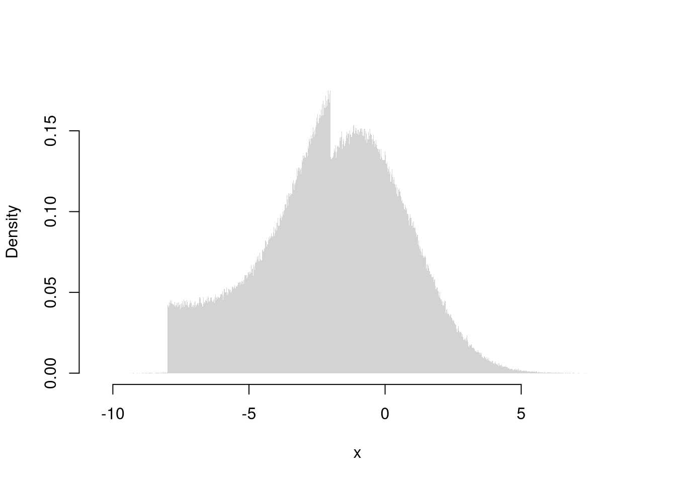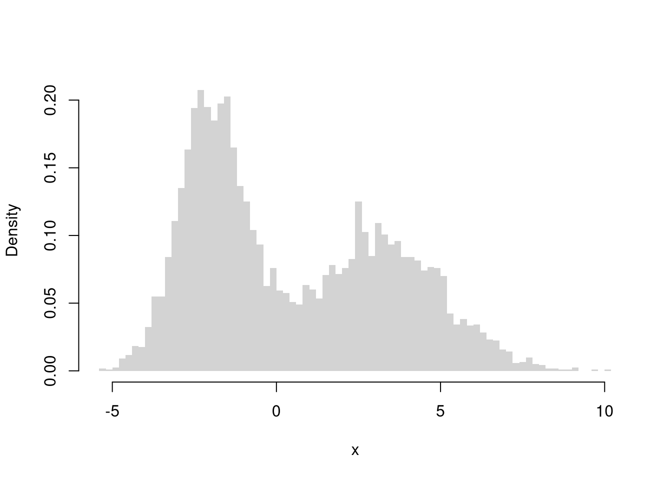 # Complicated Random Variabler_ugly0 <-function(n, populationMean=c(-2, 3), populationVar=c(1, 4), prob=c(.5,.5)){# Which distribution is each observation coming from di <-sample(1:2, size=n, replace=TRUE, prob=prob)rnorm(n, mean=populationMean[di], sd=sqrt(populationVar)[di])}X <-r_ugly0(6000)hist(X, breaks=60,freq=F, border=NA,xlab="x", main='')