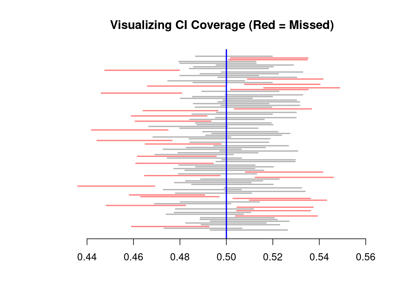 # Visualize first N confidence intervalsN <-100plot.new()plot.window(xlim =range(xq), ylim =c(0, N))for (i in1:N) { col_i <-if (covered[i]) rgb(0, 0, 0, 0.3) elsergb(1, 0, 0, 0.5)segments(xq[1, i], i, xq[2, i], i, col = col_i, lwd =2)}abline(v = mu_true, col ="blue", lwd =2)axis(1)title("Visualizing CI Coverage (Red = Missed)")
