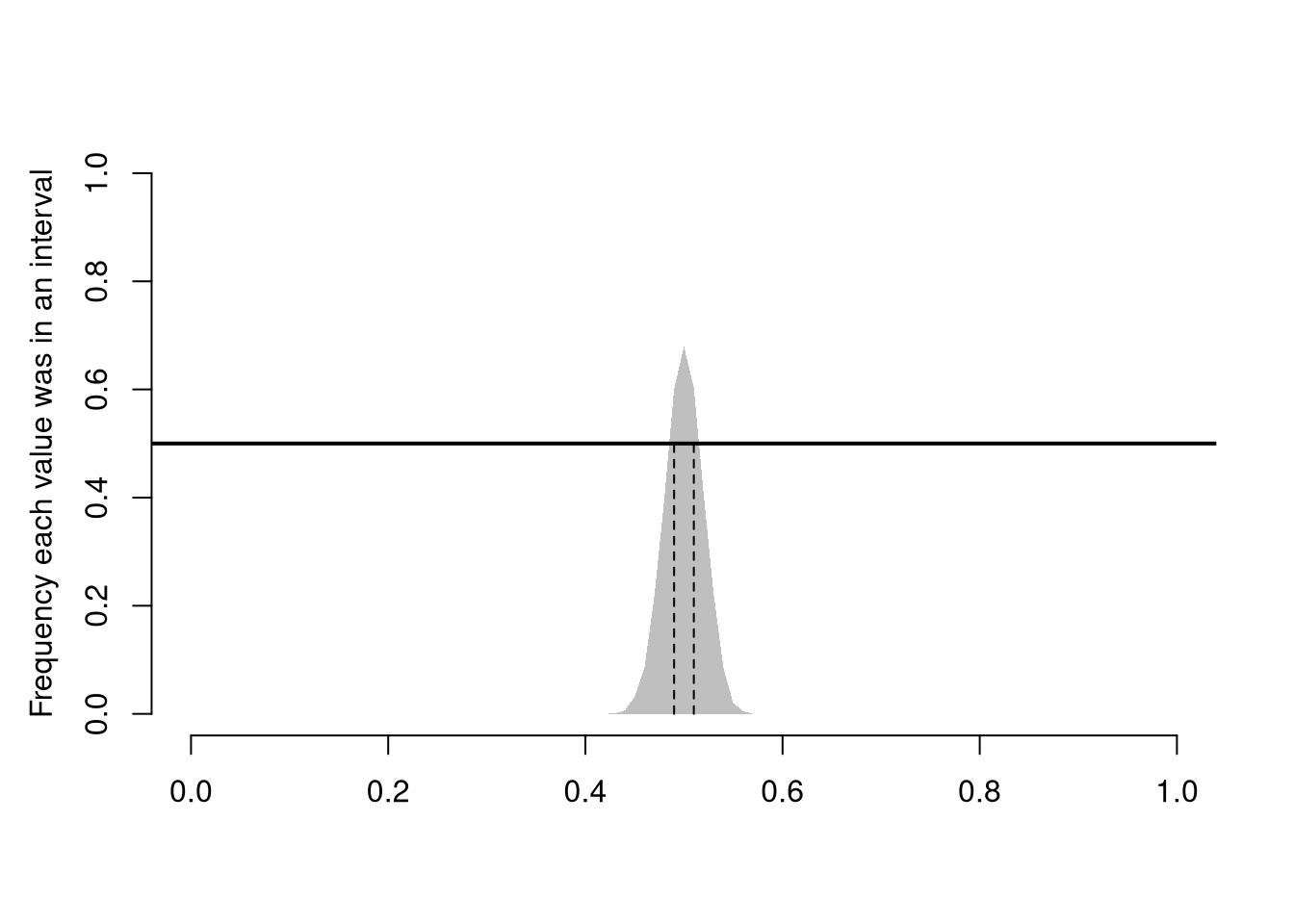 # Frequency each point was in an intervalbks <-seq(0,1,by=.01)xcovr <-sapply(bks, function(b){ bl <- b >= xq[1,] bu <- b <= xq[2,]mean( bl & bu )})# 50\% Coveragec_ul <-range(bks[xcovr>=.5])c_ul # 50% confidence interval## [1] 0.49 0.51plot.new()plot.window(xlim=c(0,1), ylim=c(0,1))polygon( c(bks, rev(bks)), c(xcovr, xcovr*0), col=grey(.5,.5), border=NA)mtext('Frequency each value was in an interval',2, line=2.5)axis(1)axis(2)abline(h=.5, lwd=2)segments(c_ul,0,c_ul,.5, lty=2)