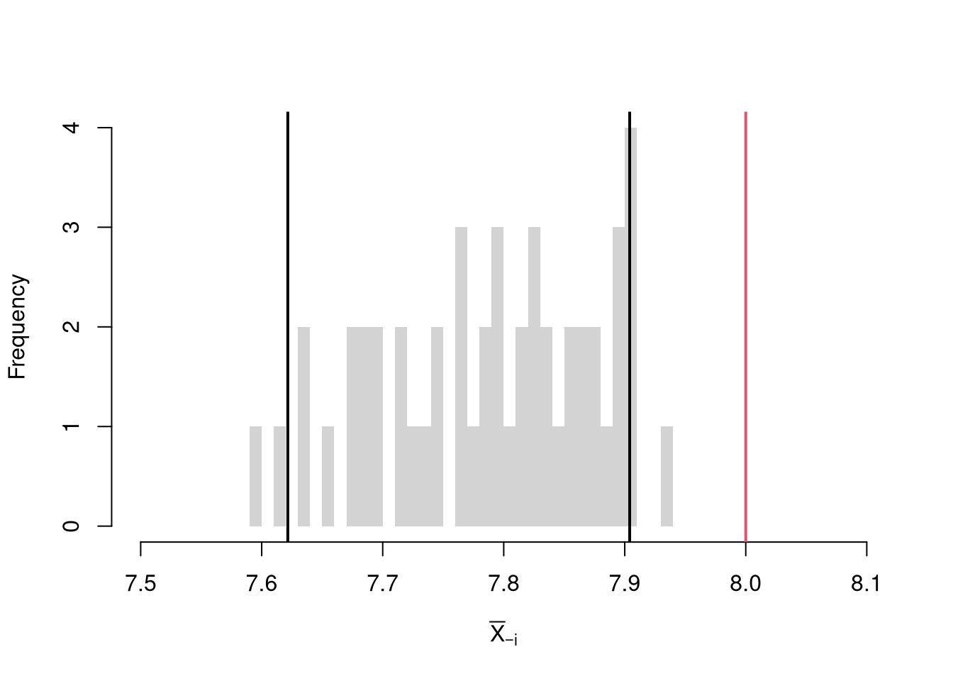 jack_se <-sd(Jmeans)mean0 <-8jack_t <- (sample_mean - mean0)/jack_se# Note that you can also use a corrected se# jack_se <- sqrt((n-1)/n) * sd(Jmeans)