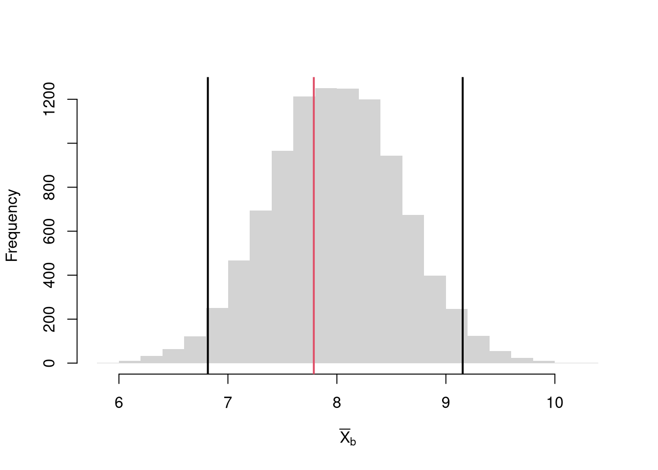 # Two-Sided Test, ALTERNATIVE: mean < 8 or mean >8# Prob(boot0_means > sample_mean or -boot0_means < sample_mean)Fhat0 <-ecdf(Bmeans0)p_left <-Fhat0(sample_mean) #Left Tailp_right <-1-Fhat0(sample_mean) #Right Tailp <-2*min(p_left, p_right)if(p >.05){message('fail to reject the null that sample_mean=8 at the 5% level')} else {message('reject the null that sample_mean=8 in favor of either <8 or >8 at the 5% level')}