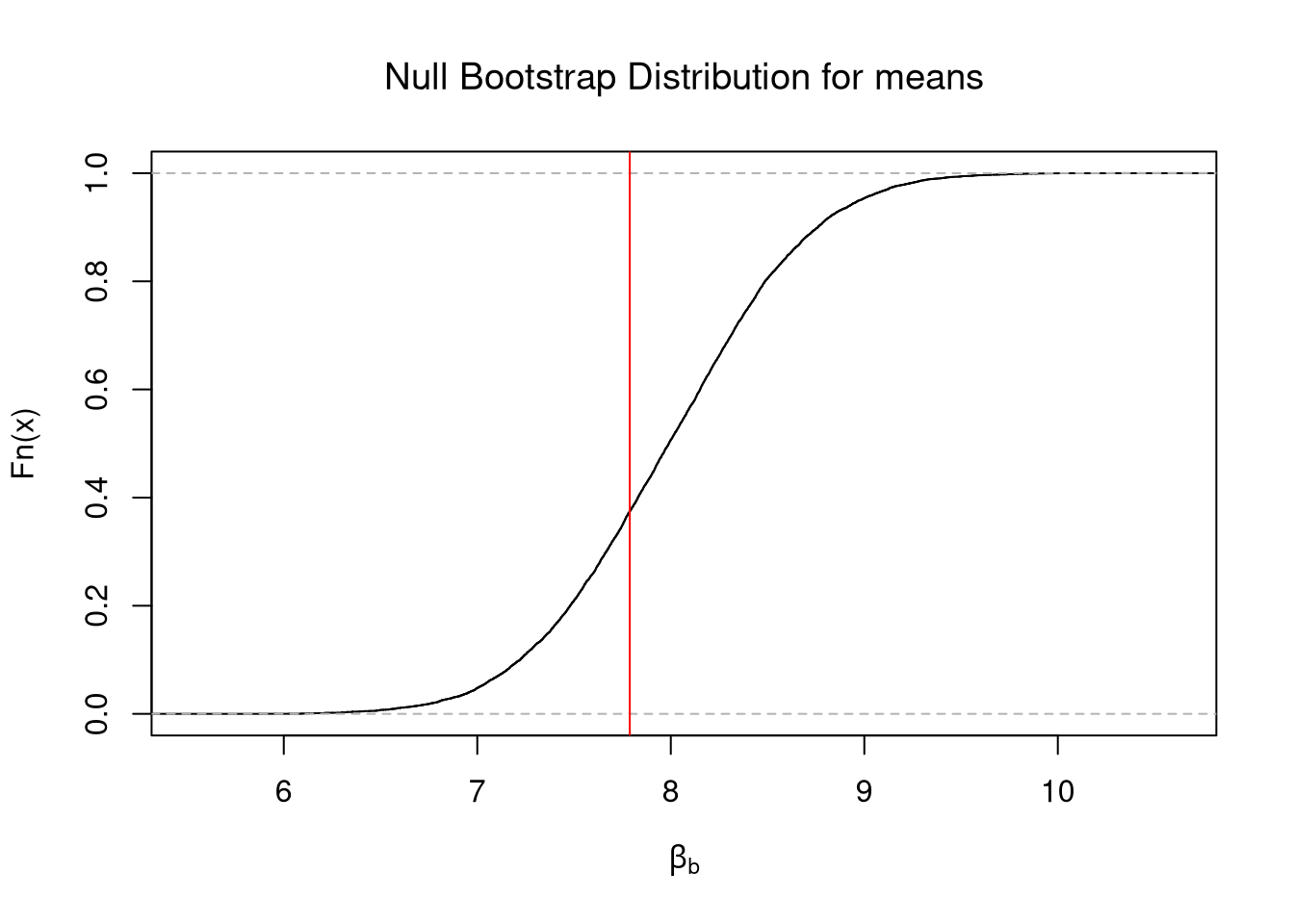 # One-Sided Test, ALTERNATIVE: mean > 8# Prob( boot0_means > sample_mean) Fhat0 <-ecdf(Bmeans0) # Right tailplot(Fhat0,xlab=expression( beta[b] ),main='Null Bootstrap Distribution for means', font.main=1)abline(v=sample_mean, col='red')