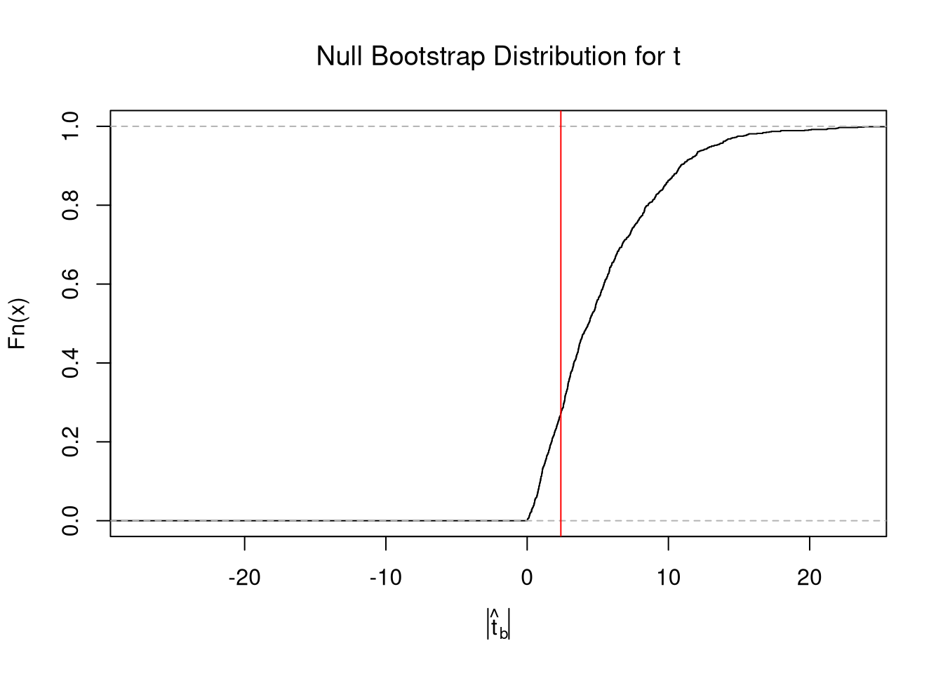 set.seed(1)boot_t0 <-sapply(1:10^3, function(i) { dat_b <-sample(sample_dat, replace=T) mean_b <-mean(dat_b) + (8- sample_mean) # impose the null by recentering# jack ses jack_se_b <-sd( sapply(1:length(dat_b), function(i){mean(dat_b[-i]) }) ) jack_t <- (mean_b - mean0)/jack_se_b})# Two Sided TestFhat0 <-ecdf(abs(boot_t0))plot(Fhat0, xlim=range(boot_t0, jack_t),xlab=expression( abs(hat(t)[b]) ),main='Null Bootstrap Distribution for t', font.main=1)abline(v=abs(jack_t), col='red')