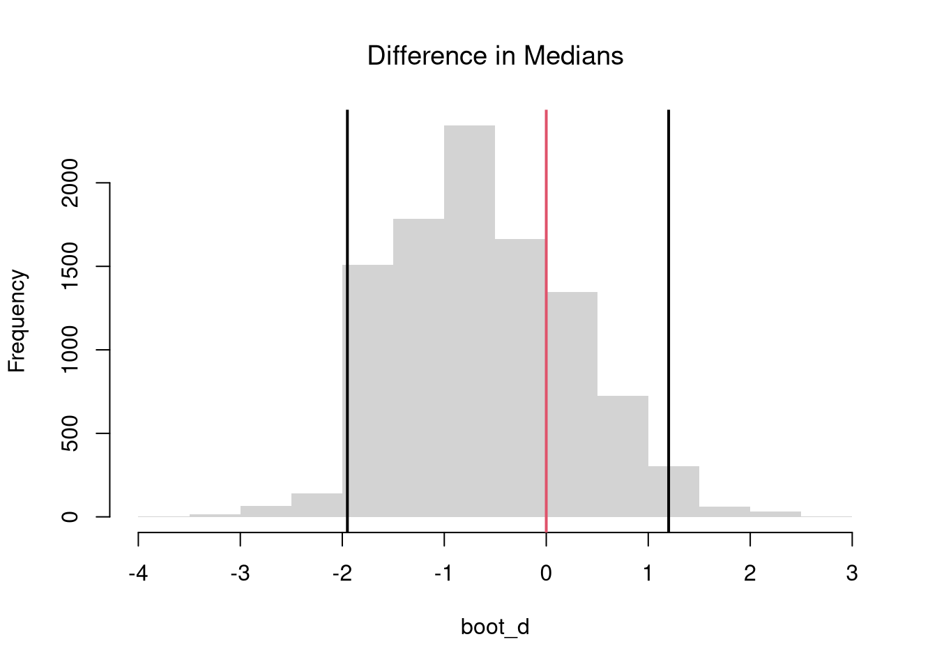 # Bootstrap Distribution Functionboot_d <-sapply(1:10^4, function(b, q_null=7.8){ x_b <-sample(sample_dat, replace=T) q_b <-quantile(x_b, probs=.5) d_b <- q_b - q_nullreturn(d_b)})# 2-Sided Test for Median Differencehist(boot_d, border=NA, font.main=1,main='Difference in Medians')abline(v=quantile(boot_d, probs=c(.025, .975)), lwd=2)abline(v=0, lwd=2, col=2)