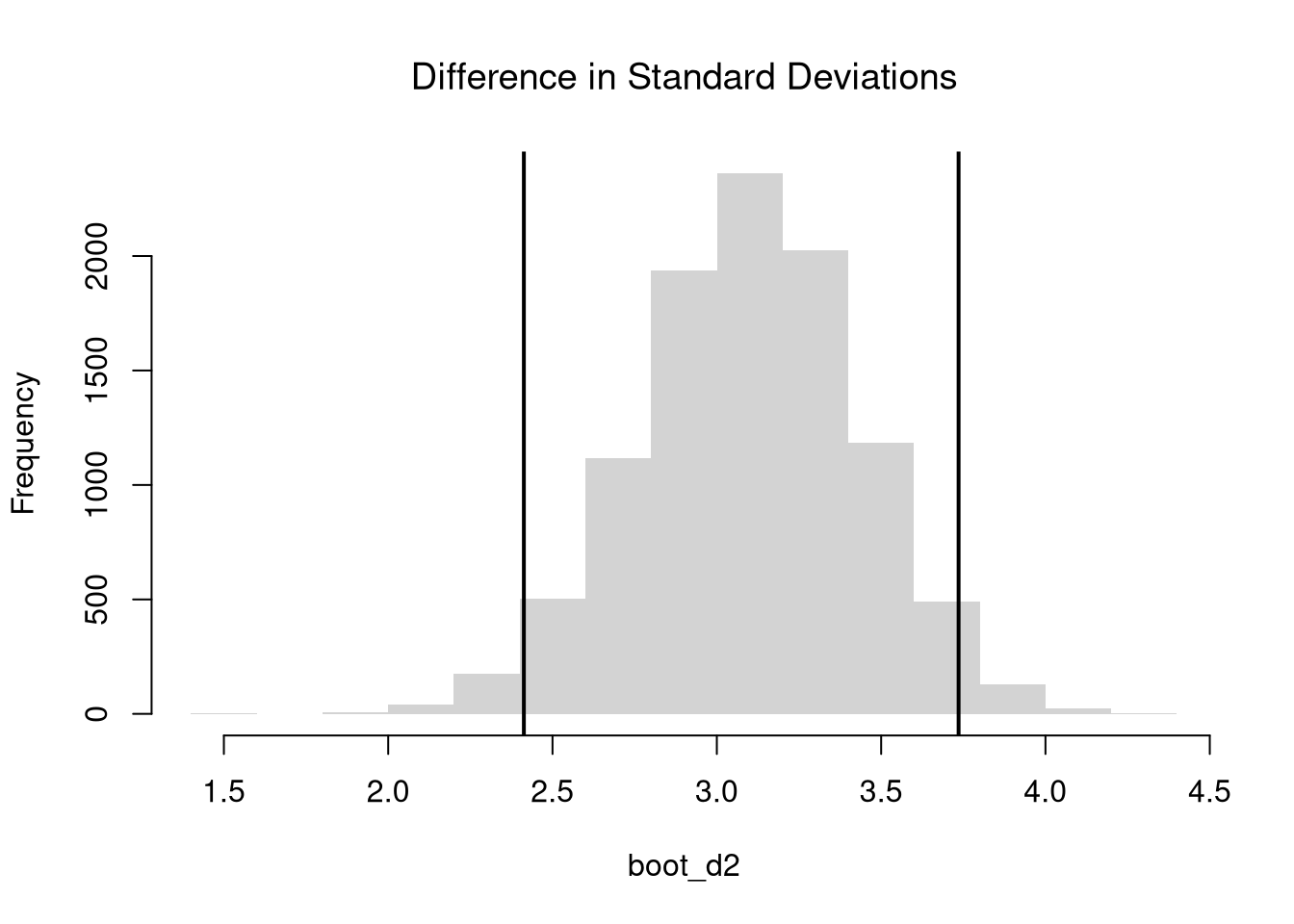 # 2-Sided Test for SD Differencesboot_d2 <-sapply(1:10^4, function(b, sd_null=1.2){ x_b <-sample(sample_dat, replace=T) sd_b <-sd(x_b) d_b <- sd_b - sd_nullreturn(d_b)})hist(boot_d2, border=NA, font.main=1,main='Difference in Standard Deviations')abline(v=quantile(boot_d2, probs=c(.025, .975)), lwd=2)abline(v=0, lwd=2, col=2)