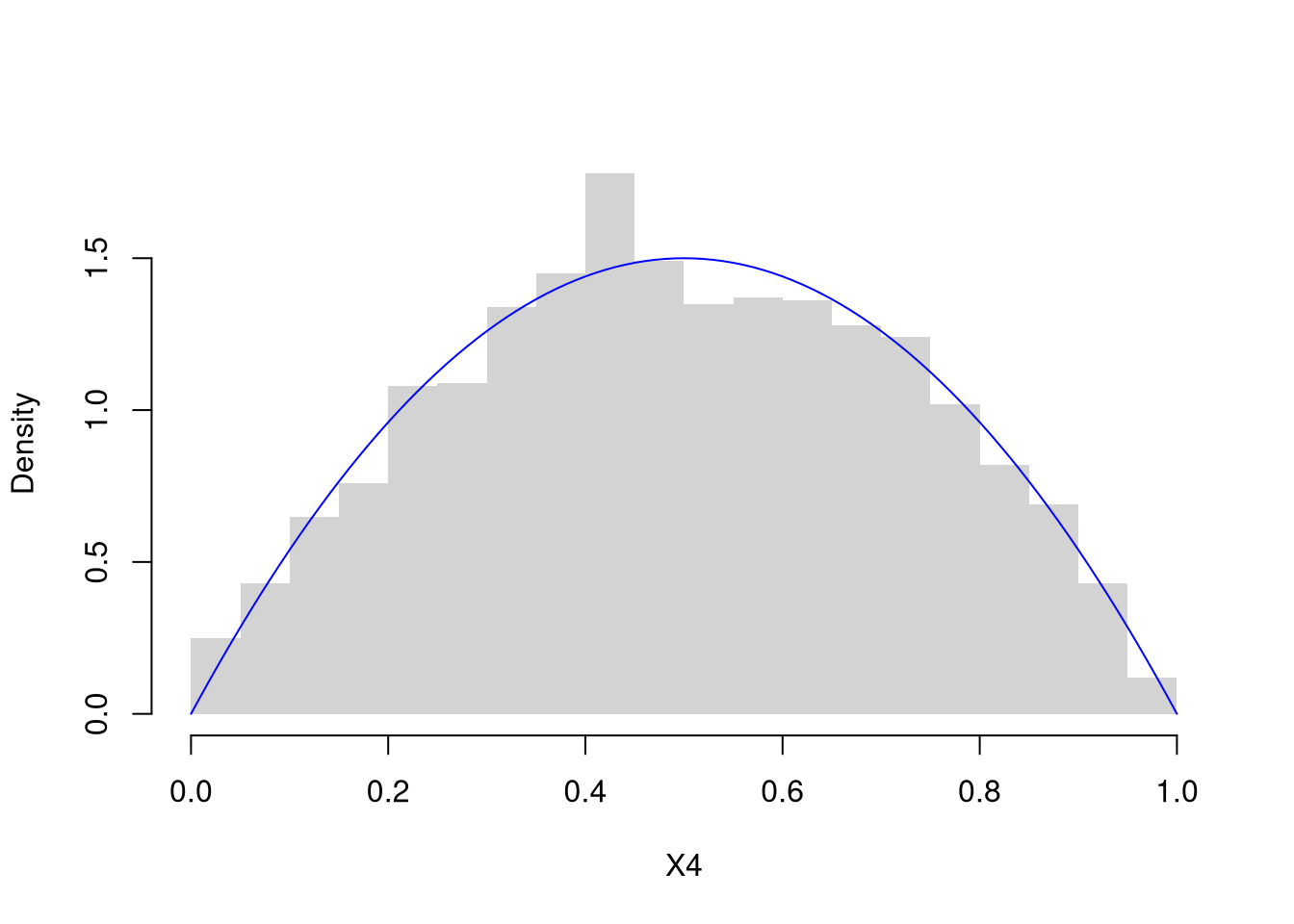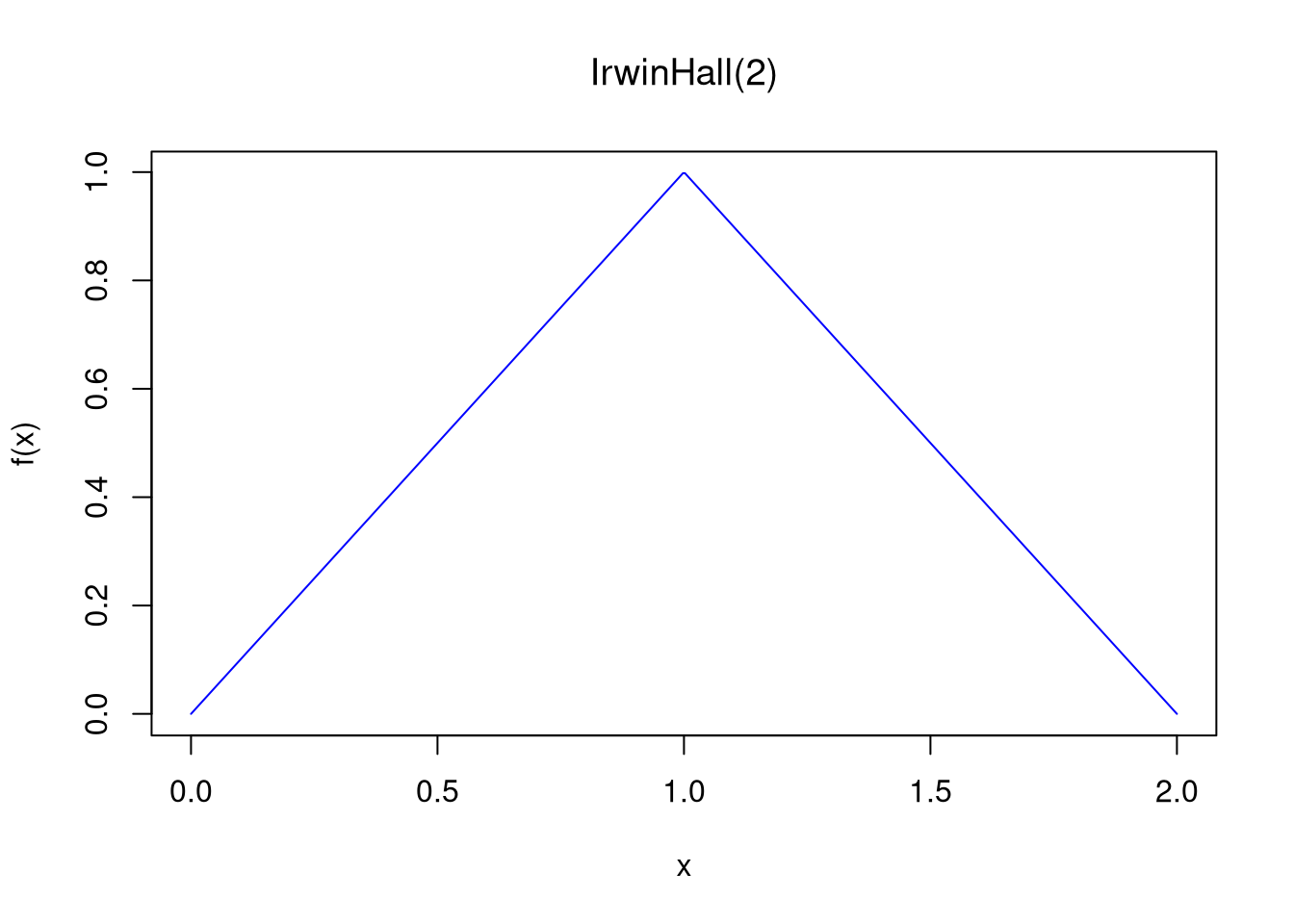 ## Minimal example (base R)# Irwin–Hall PDF functiondirwinhall <-function(x, n) { f_x <-vector(length=length(x))for(i inseq(x)) { xx <- x[i]if(xx <0| xx > n){ f_x[i] <-0 } else { k <-seq(0, floor(xx)) f_k <-sum((-1)^k*choose(n, k)*(xx-k)^(n-1))/factorial(n-1) f_x[i] <- f_k } }return(f_x)}# Parametersn <-2x <-seq(0, n, length.out =500)# Compute and plot PDFf_x <-dirwinhall(x, n)plot(x, f_x, type="l", col="blue",main='', xlab ="x", ylab ="f(x)")title(bquote(paste('IrwinHall(',.(n), ')')))