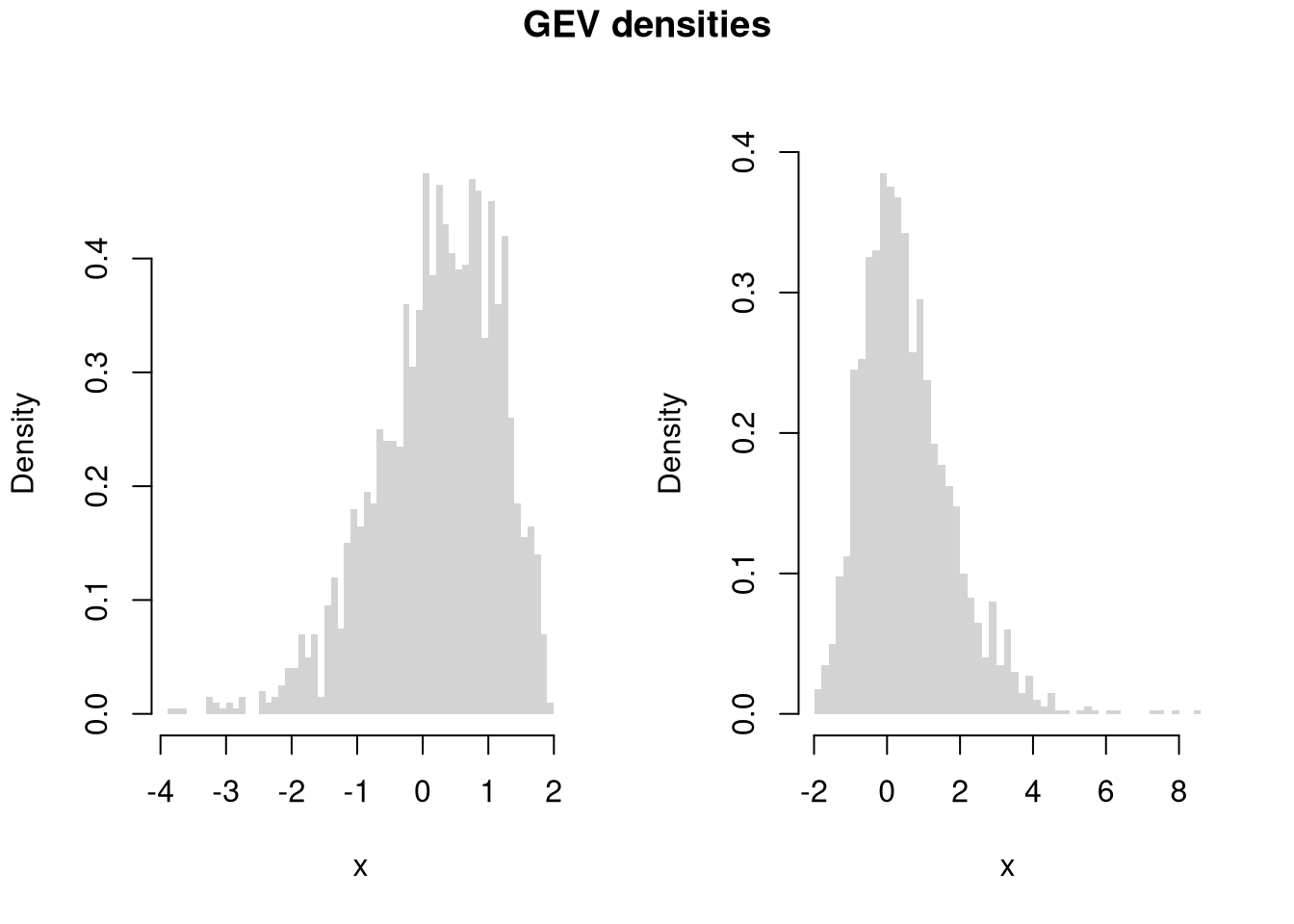 # install.packages("extraDistr"), once everlibrary(extraDistr) # every time you need itpar(mfrow=c(1,2))for(p inc(-.5,0)){ x <-rgev(2000, mu=0, sigma=1, xi=p)hist(x, breaks=50, border=NA, main=NA, freq=F)}title('GEV densities', outer=T, line=-1)
