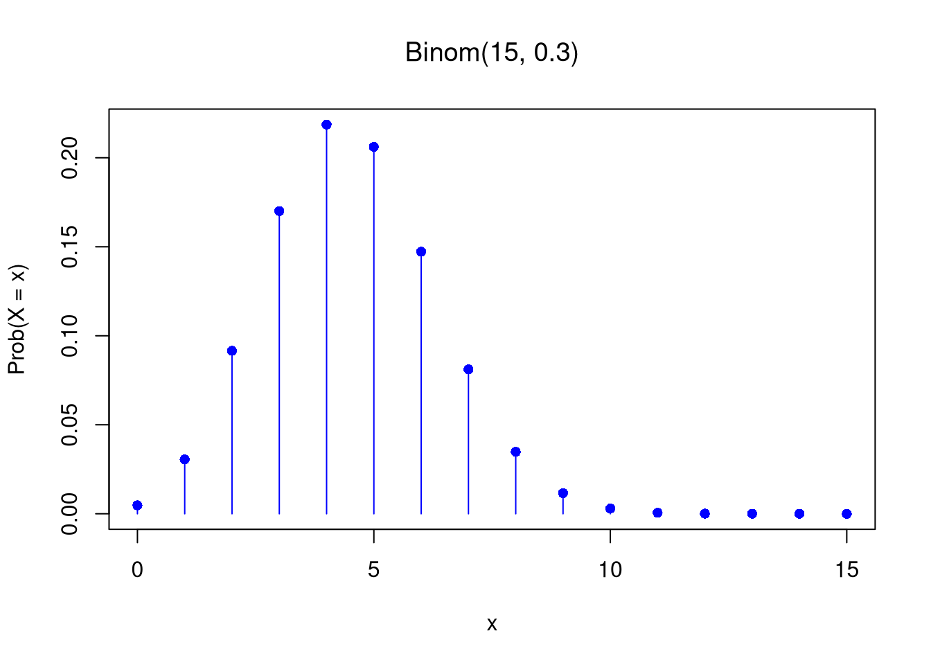 Probability Mass Function: \(Prob(X_{i}=x)=\binom{n}{x}p^{x}(1-p)^{n-x}\)