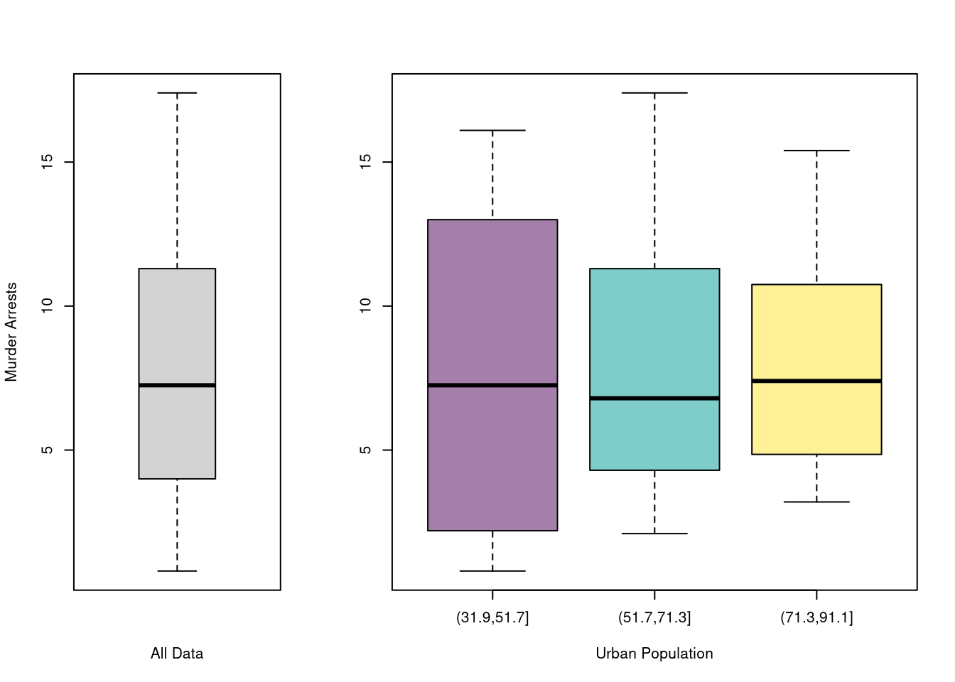 # main='US Murder arrests (per 100,000)')You can also split data into grouped boxplots in the same way