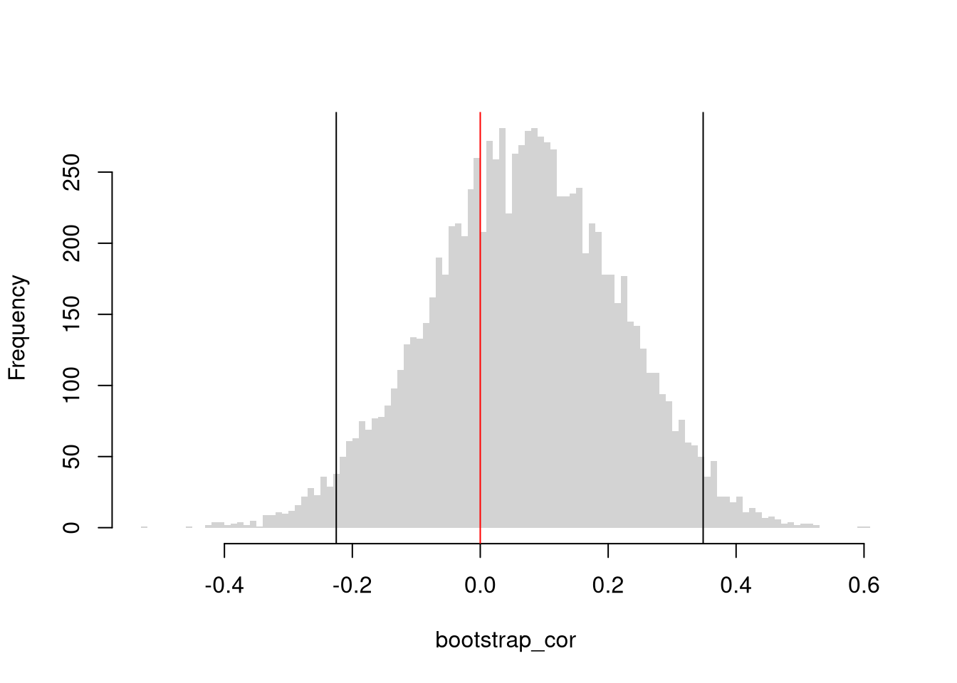 xy <- USArrests[,c('Murder','UrbanPop')]xy_cor <-cor(xy[, 1], xy[, 2])#plot(xy, pch=16, col=grey(0,.25))# Bootstrap Distribution of Kendall Correlationn <-nrow(xy)bootstrap_cor <-vector(length=9999)for(b inseq(bootstrap_cor) ){ xy_b <- xy[sample(n, replace=T),] xy_cor_b <-cor(xy_b[, 1], xy_b[, 2]) bootstrap_cor[b] <- xy_cor_b}hist(bootstrap_cor, breaks=100,border=NA, font.main=1,main='')## Test whether correlation is statistically different from 0boot_ci <-quantile(bootstrap_cor, probs=c(0.025, 0.975))abline(v=boot_ci)abline(v=0, col='red')