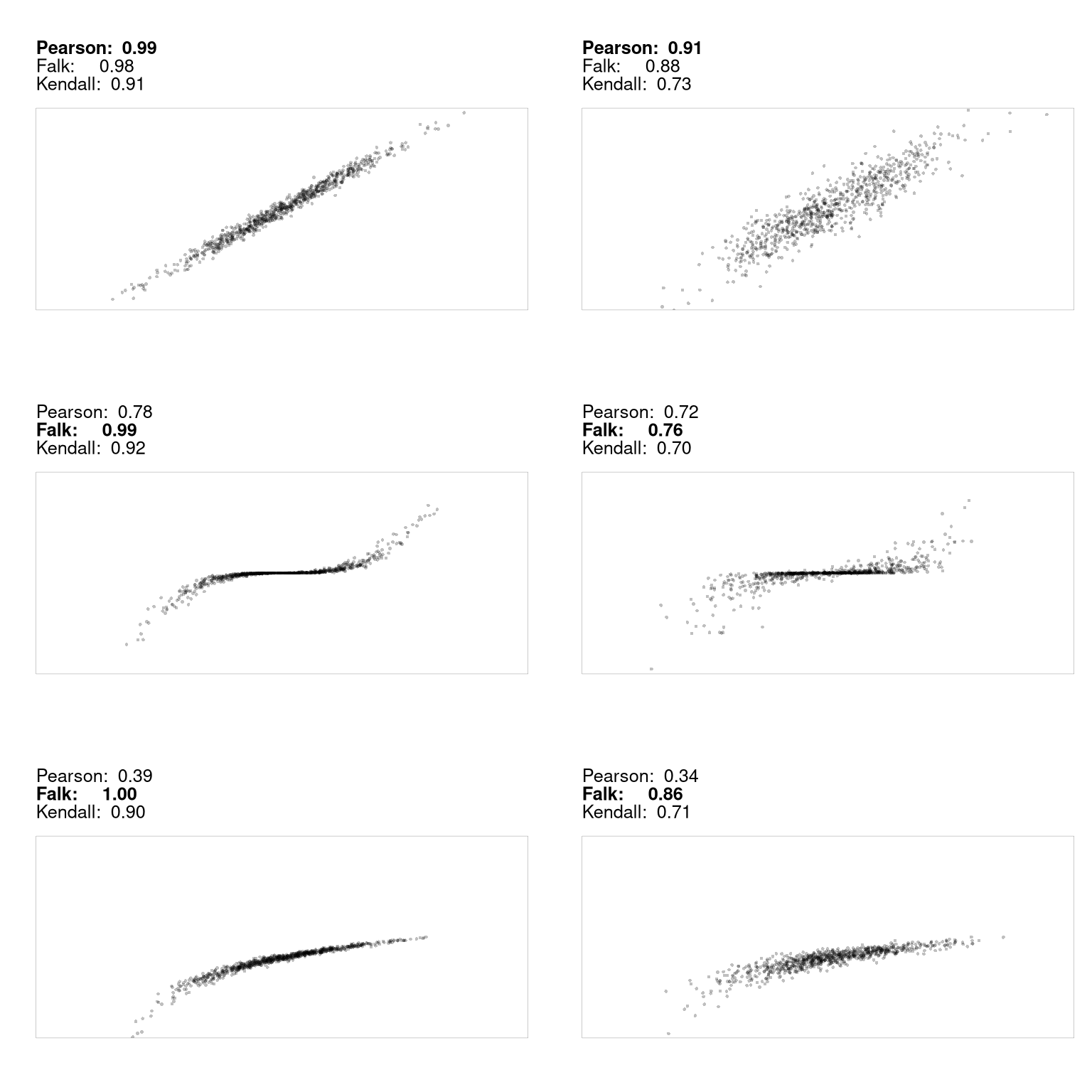 Falk Codeviance. The Codeviance, \(\tilde{C}_{XY}\), is a robust alternative to Covariance. Instead of relying on means (which can be sensitive to outliers), it uses medians.1 We can also scale the Codeviance by the median absolute deviation to compute the median correlation, which typically lies in \([-1,1]\) but not always. Letting \(\tilde{M}_{X}\) and \(\tilde{M}_{Y}\) denote the median of \(\hat{X}\) and \(\hat{Y}\), we have \[\begin{eqnarray}