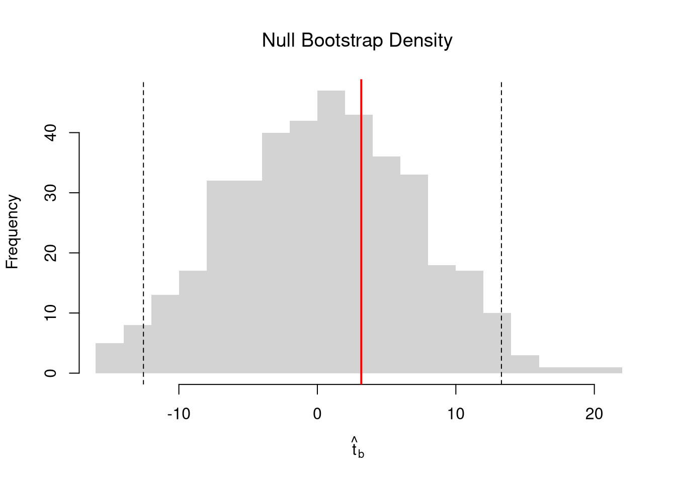 We can also compute a null distribution. We focus on the simplest: bootstrap simulations that each impose the null hypothesis and re-estimate the statistic of interest. Specifically, we compute the distribution of t-values on data with randomly reshuffled outcomes (imposing the null), and compare how extreme the observed value is.
