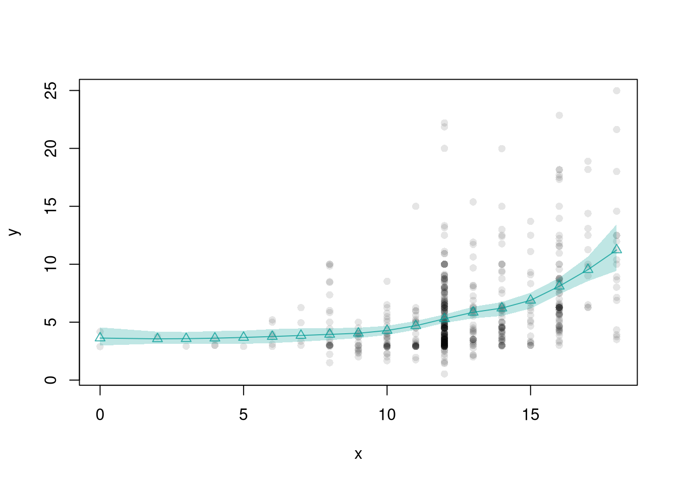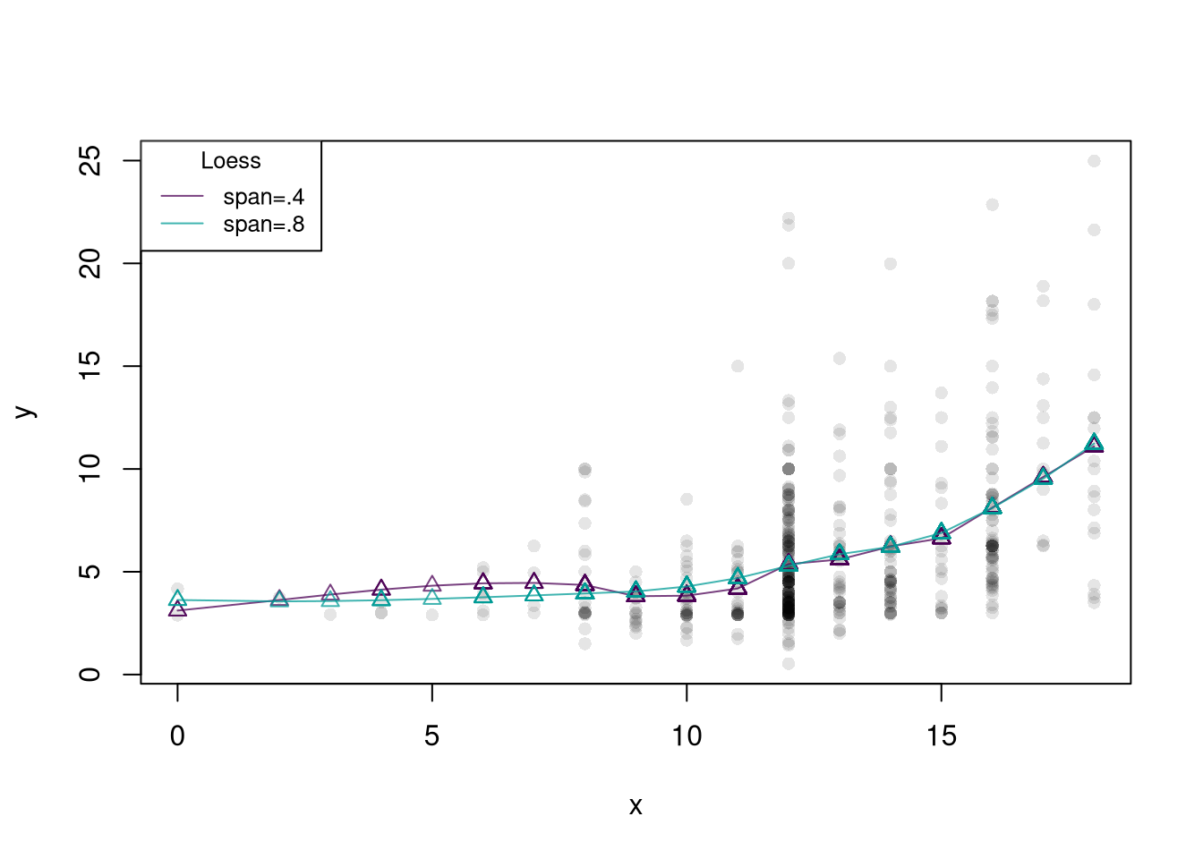 # Local relationship: wages and educationlibrary(wooldridge)## Plot 1plot(wage~educ, data=wage1, pch=16, col=grey(0,.1))educ_means <-aggregate(wage1[,c("wage","educ")],list(wage1[,'educ']), mean)points(wage~educ, data=educ_means, pch=17, col='blue', type='b')title("Grouped Means and Scatterplot", font.main=1)