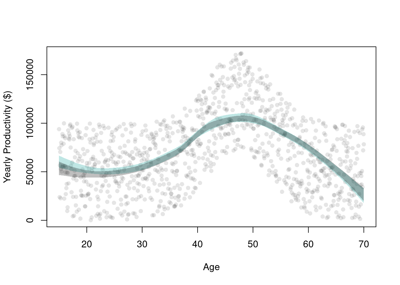## AgesXmx <-70Xmn <-15##Generate Sample Datadat_sim <-function(n=1000){ n <-1000 X <-seq(Xmn,Xmx,length.out=n)## Random Productivity e <-runif(n, 0, 1E6) beta <-1E-10*exp(1.4*X -.015*X^2) Y <- (beta*X + e)/10return(data.frame(Y,X))}dat <-dat_sim(1000)## Data from one sampleplot(Y~X, data=dat, pch=16, col=grey(0,.1),ylab='Yearly Productivity ($)', xlab='Age' )dat0 <- dat[order(dat[,'X']),]reg_lo <-loess(Y~X, data=dat0, span=.8)## Plot Bootstrap CI for Single Samplepred_design <-data.frame(X=seq(Xmn, Xmx))preds_lo <-predict(reg_lo, newdata=pred_design)boot_lo <-sapply(1:399, function(b){ dat0_i <- dat0[sample(nrow(dat0), replace=T),] reg_i <-loess(Y~X, dat=dat0_i, span=.8)predict(reg_i, newdata=pred_design)})boot_cb <-apply(boot_lo,1, quantile,probs=c(.025,.975), na.rm=T)polygon(c(pred_design[[1]], rev(pred_design[[1]])),c(boot_cb[1,], rev(boot_cb[2,])),col=hcl.colors(3,alpha=.25)[2],border=NA)# Construct CI across Multiple Samplessample_lo <-sapply(1:399, function(b){ xy_b <-dat_sim(1000) #Entirely new sample reg_b <-loess(Y~X, dat=xy_b, span=.8)predict(reg_b, newdata=pred_design)})ci_lo <-apply(sample_lo,1, quantile,probs=c(.025,.975), na.rm=T)polygon(c(pred_design[[1]], rev(pred_design[[1]])),c(ci_lo[1,], rev(ci_lo[2,])),col=grey(0,alpha=.25),border=NA)