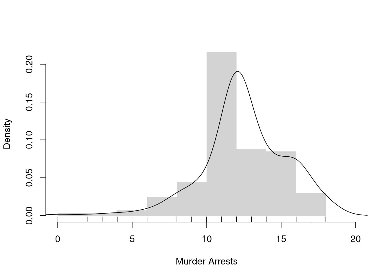 # Practical ExampleX <- wage1[,'educ']hist(X,breaks=seq(0,20,by=2), #bin width=1freq=F,border=NA, main='',xlab='Murder Arrests')# Density Estimatelines(density(X, bw=1))# Raw Observationsrug(wage1[,'educ'], col=grey(0,.5))