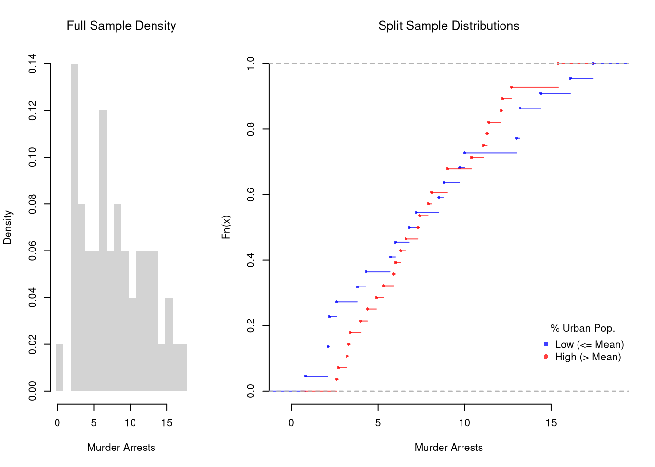 # main='US Murder arrests (per 100,000)')You can also split data into more than two groups. For more than three groups, boxplots are often more effective than histograms or ECDF’s.