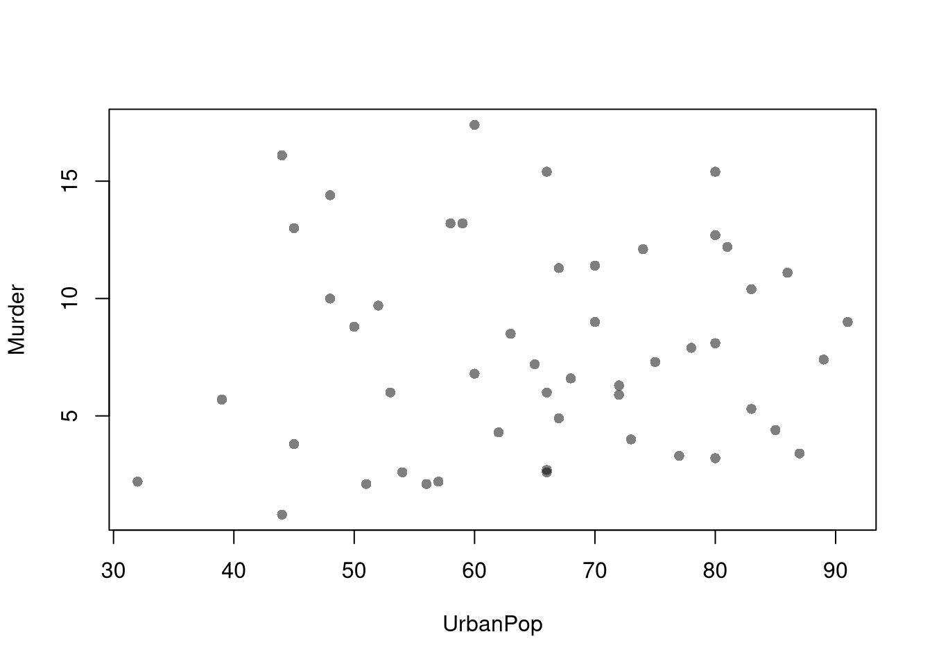 plot(Murder~UrbanPop, USArrests, pch=16, col=rgb(0,0,0,.5))