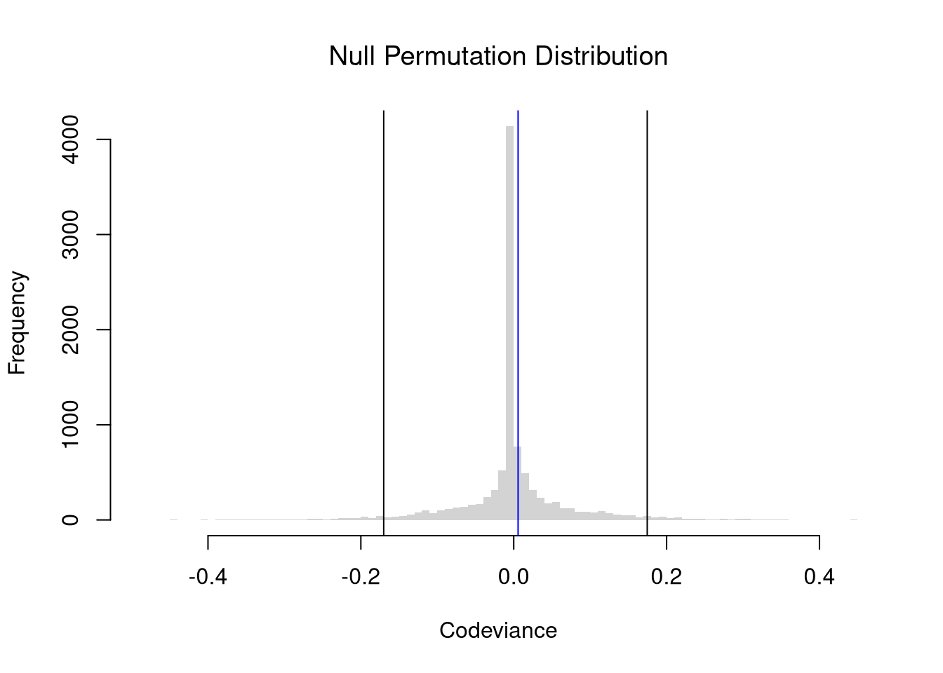 ## [1] 0.005707763You construct sampling distributions and conduct hypothesis tests for Falk’s Codeviance statistic in the same way you do for Pearson’s Correlation statistic.