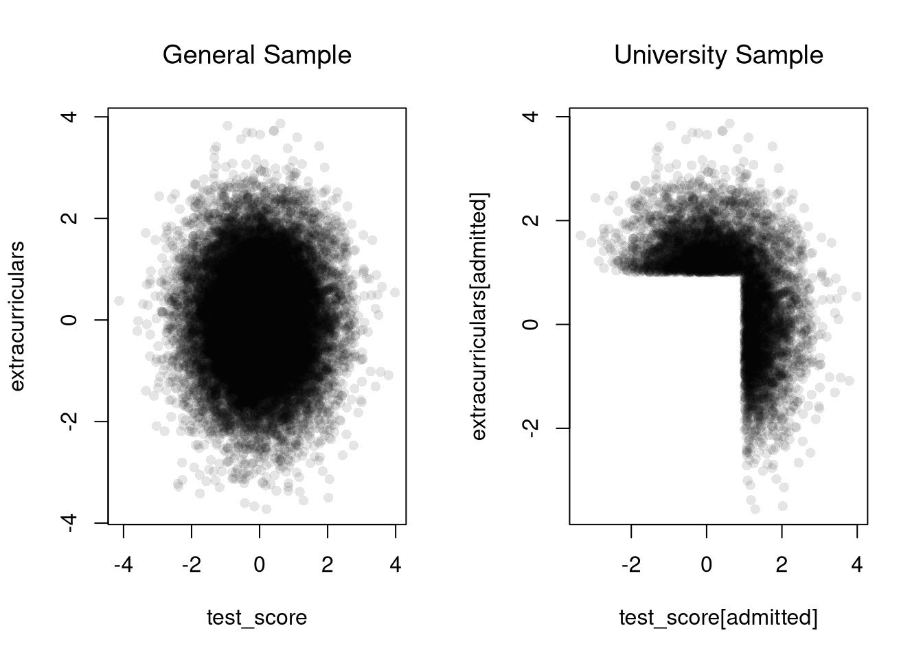 ## [1] 0.8183118Consider an admissions rule into university: applicants are accepted if they have either high test scores or strong extracurriculars. Even if there is no general relationship between test scores and extracurriculars, you will see one amongst university students.