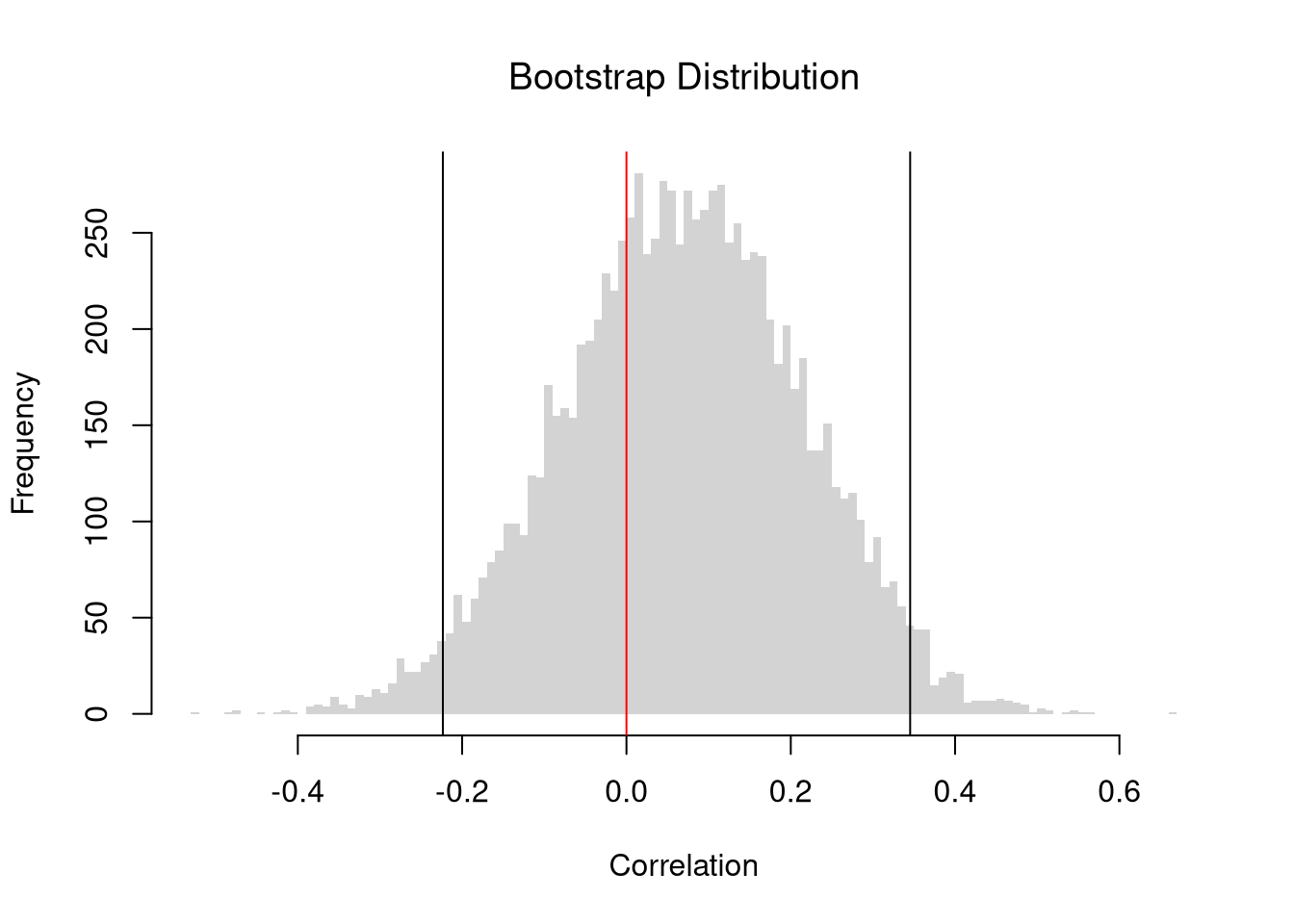 ## [1] 0.074You construct sampling distributions and conduct hypothesis tests for Kendall’s rank correlation statistic in the same way you do as for Pearson’s Correlation statistic and Falk’s Codeviance statistic.