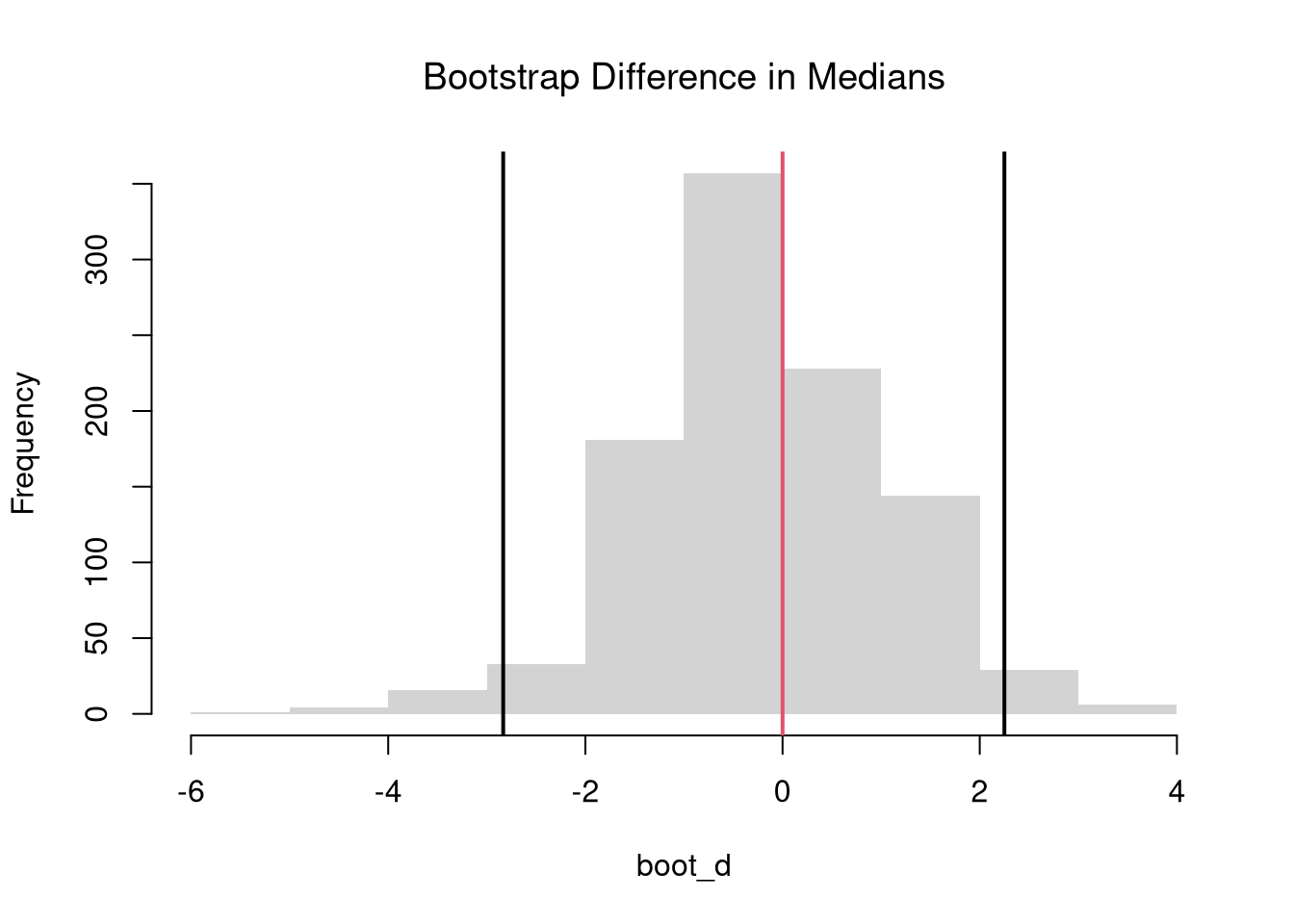 The above procedure is quite general and extends to other quantiles. Note that bootstrap tests can perform poorly with highly unequal variances or skewed data. To see this yourself, make a simulation with skewed data and unequal variances.