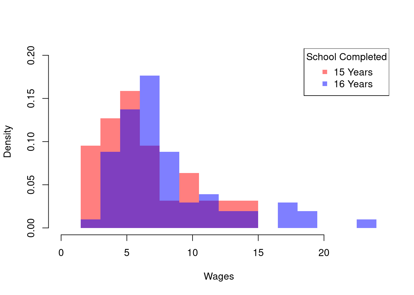 head(wage1)To compare wages for people with and without completing a degree, we start by making a histogram for both groups.