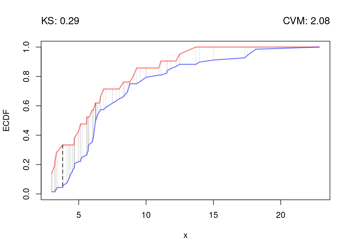 The starting point for hypothesis testing is the Kolmogorov-Smirnov Statistic: the maximum absolute difference between two CDF’s over all sample data \(y \in \{Y_1\} \cup \{Y_2\}\). \[\begin{eqnarray} \hat{KS} &=& \max_{y} |\hat{F}_{1}(y)- \hat{F}_{2}(y)|^{p}, \end{eqnarray}\] where \(p\) is an integer (typically 1). An intuitive alternative is the Cramer-von Mises Statistic: the sum of absolute differences (raised to an integer, typically 2) between two CDF’s. \[\begin{eqnarray} \hat{CVM} &=& \sum_{y} | \hat{F}_{1}(y)- \hat{F}_{2}(y)|^{p}. \end{eqnarray}\]
