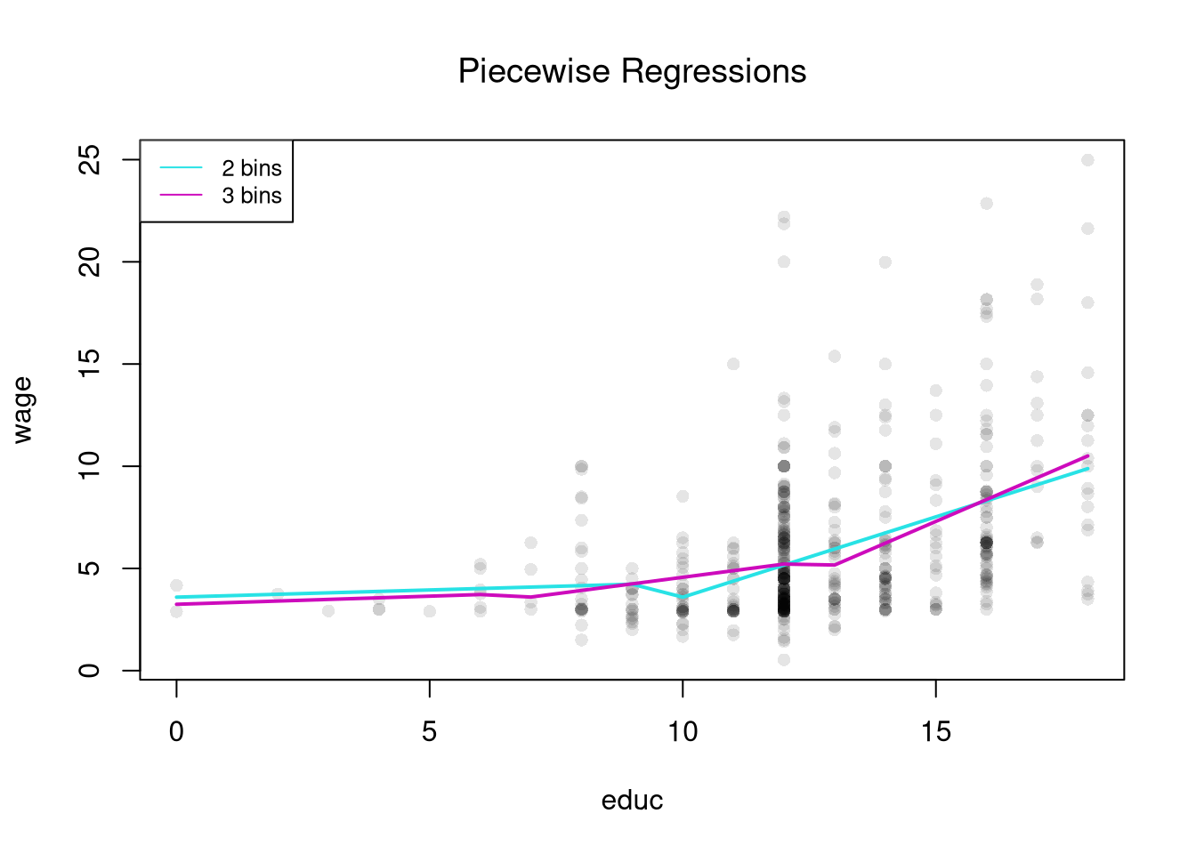 # Dataplot(wage~educ, data=wage1, pch=16, col=grey(0,.1))dat <- wage1[order(wage1[,'educ']), c('wage','educ')]## Simple Regressionreg <-lm(wage~educ, data=dat) ## OLS# Regressogram: Course Age Binsdat[,'xcc'] <-cut(dat[,'educ'], 2)rgram_c <-lm(wage~xcc, data=dat)# Regressogram: Fine Age Binsdat[,'xcf'] <-cut(dat[,'educ'], 3)rgram_f <-lm(wage~xcf, data=dat)# Regressogram (Means for each level)dat[,'xd'] <-as.factor(dat[,'educ'])rgram_d <-lm(wage~xd, data=dat)## Compare Models (Only 2 for simplicity)lines( dat[,'educ'], predict(reg), lwd=2, col=2)lines( dat[,'educ'], predict(rgram_f), lwd=2, col=4, type='s')legend('topleft',legend=c('Linear Regression','Regressogram (3)'),col=c(2,4),lty=1, cex=.8)