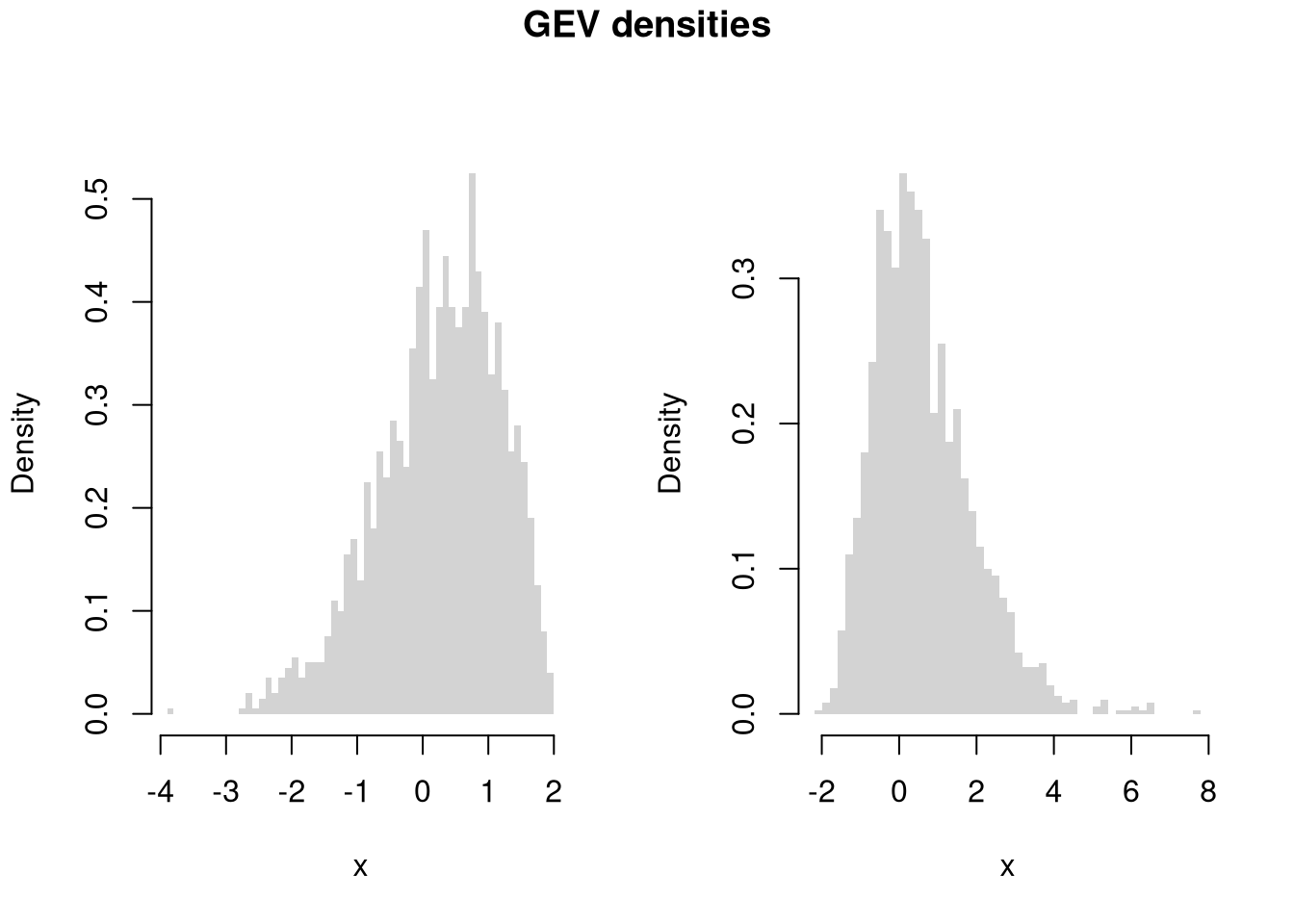 x <- rgev(2000, mu=0, sigma=1, xi=p)