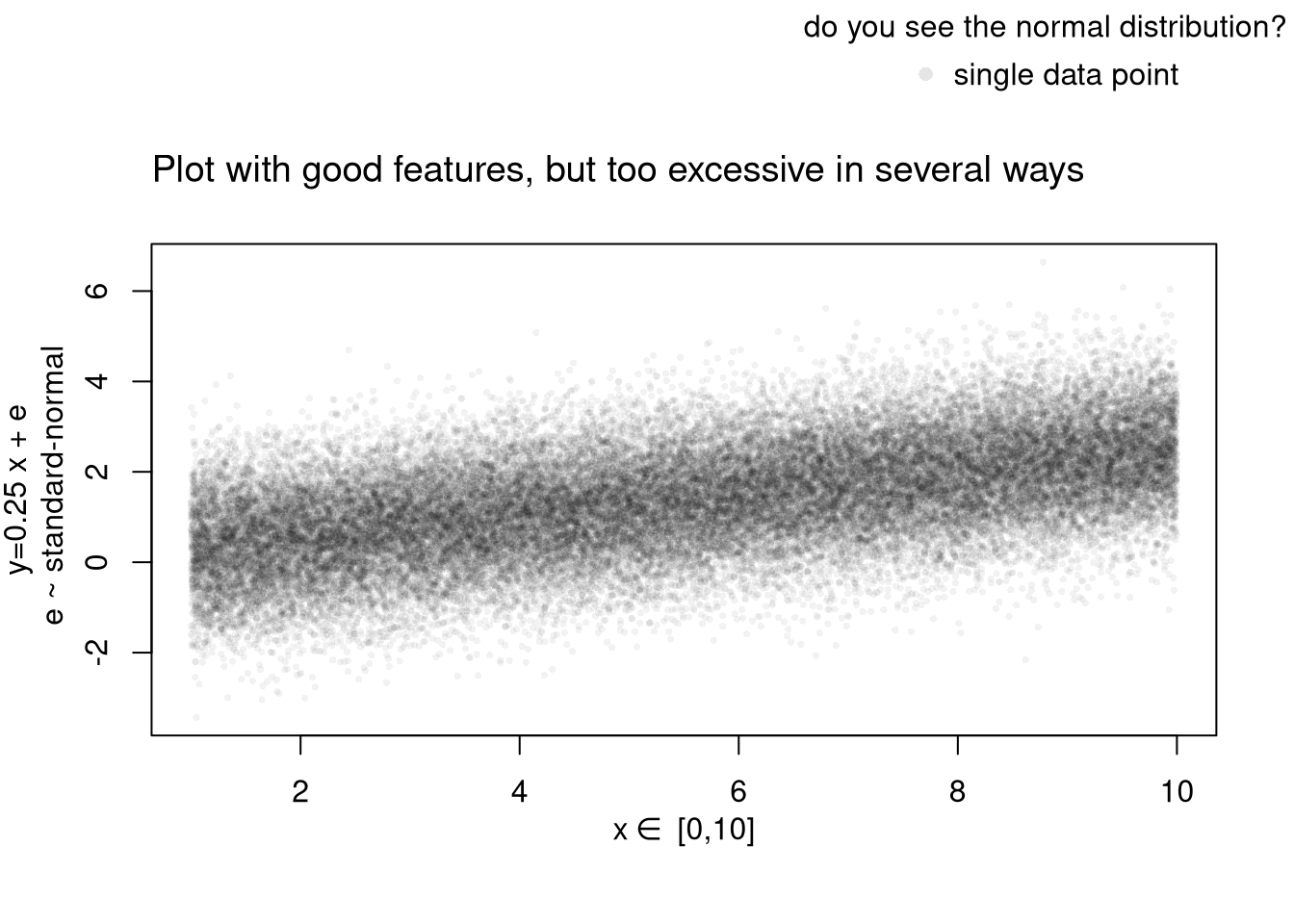 mtext( 'y=0.25 x + e\n e ~ standard-normal', 2, line=2.2)