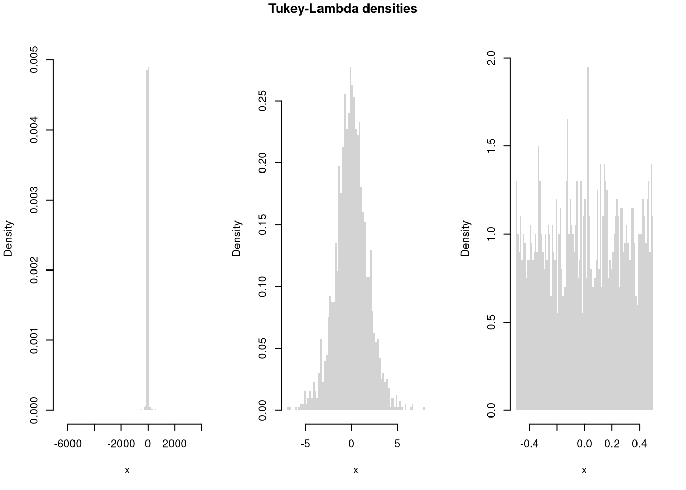 title('Tukey-Lambda densities', outer=T, line=-1)