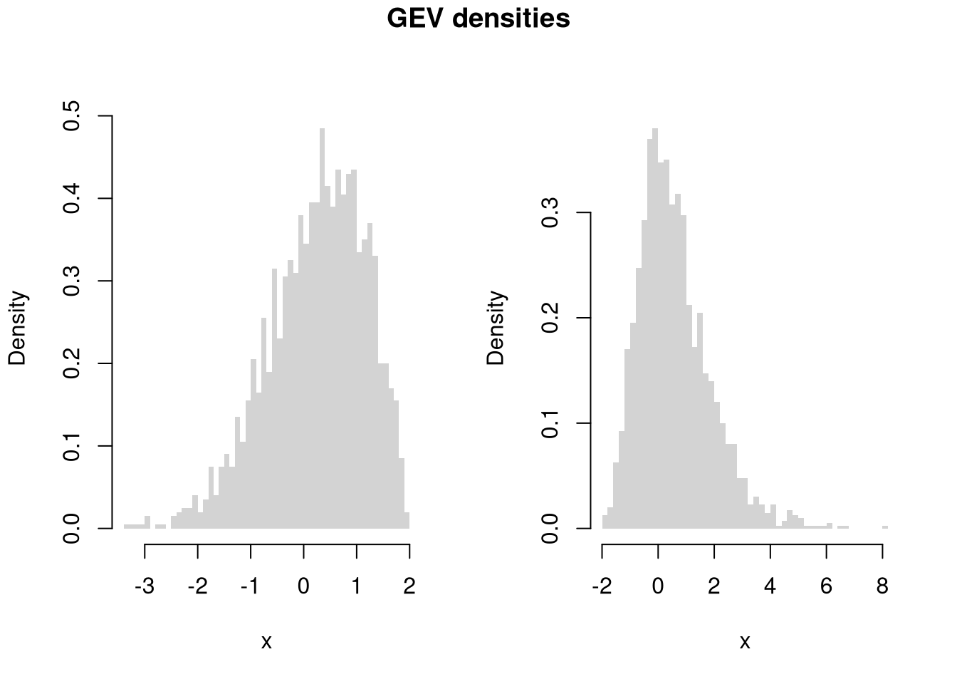x <- rgev(2000, mu=0, sigma=1, xi=p)