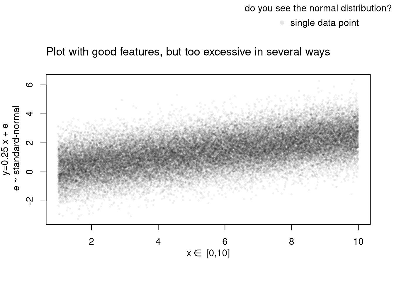 mtext( 'y=0.25 x + e\n e ~ standard-normal', 2, line=2.2)