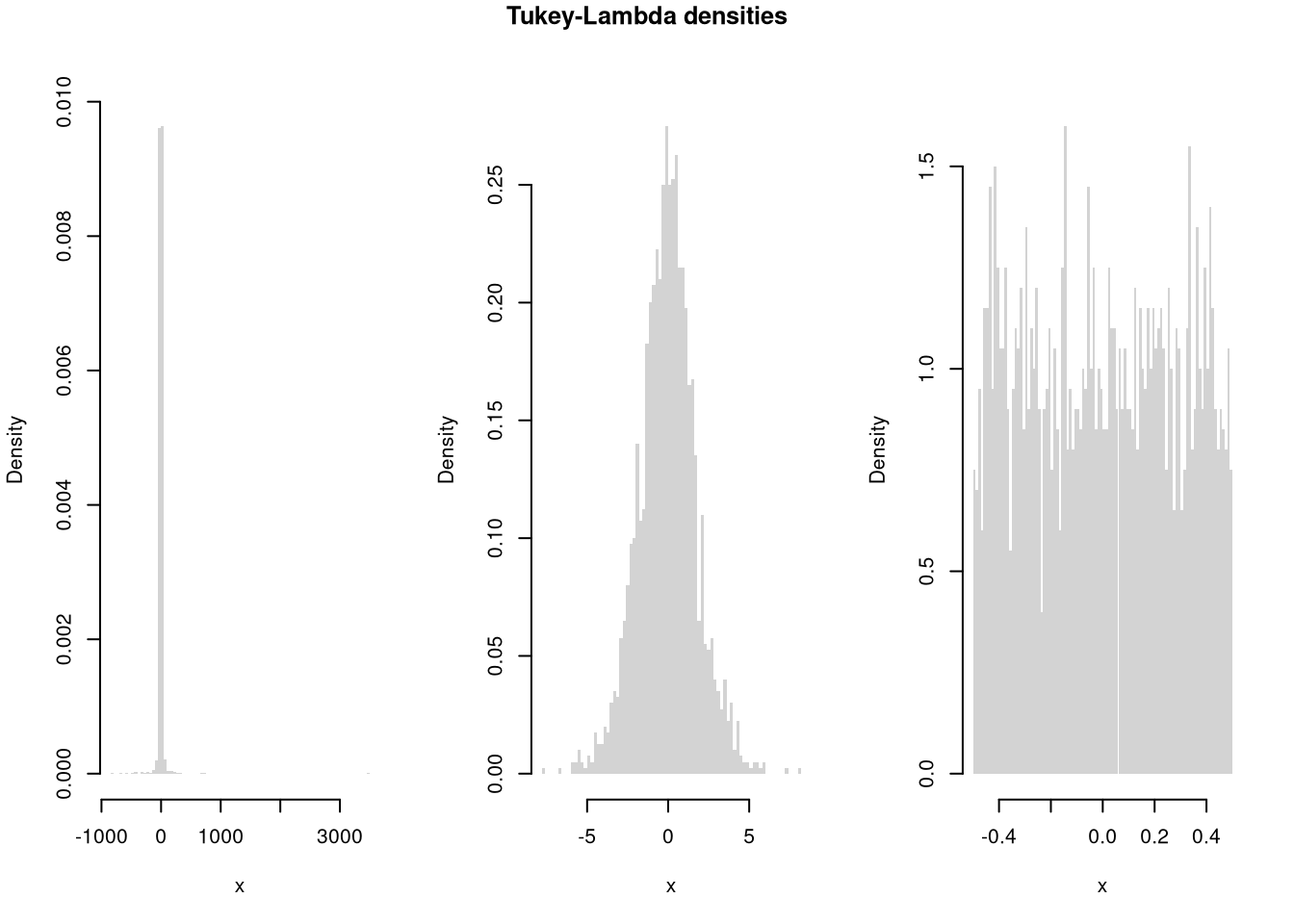 title('Tukey-Lambda densities', outer=T, line=-1)