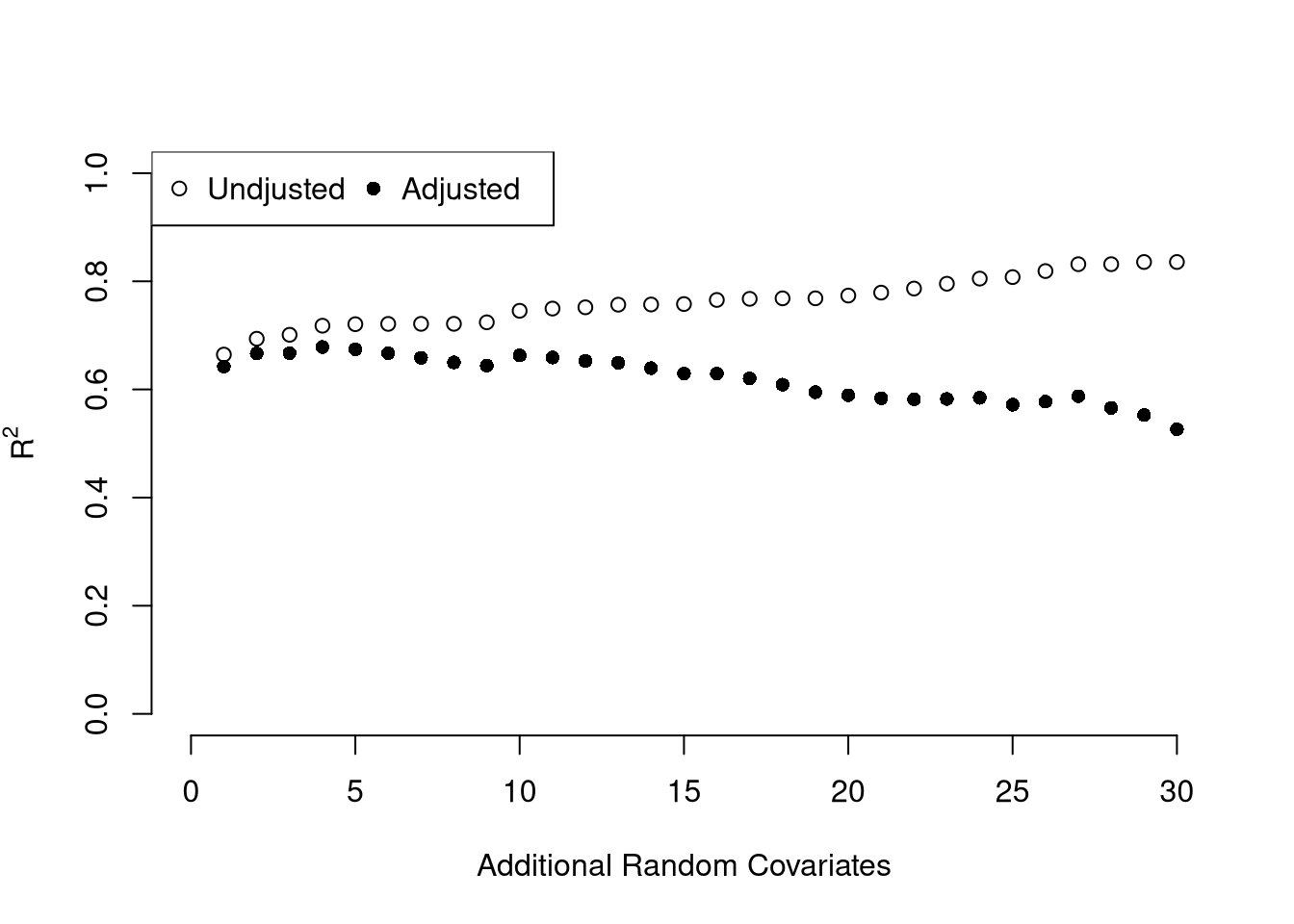 We can also again compute sums of squared errors. Adding random data may sometimes improve the fit, however, so we adjust the \(R^2\) by the number of covariates \(K\). \[