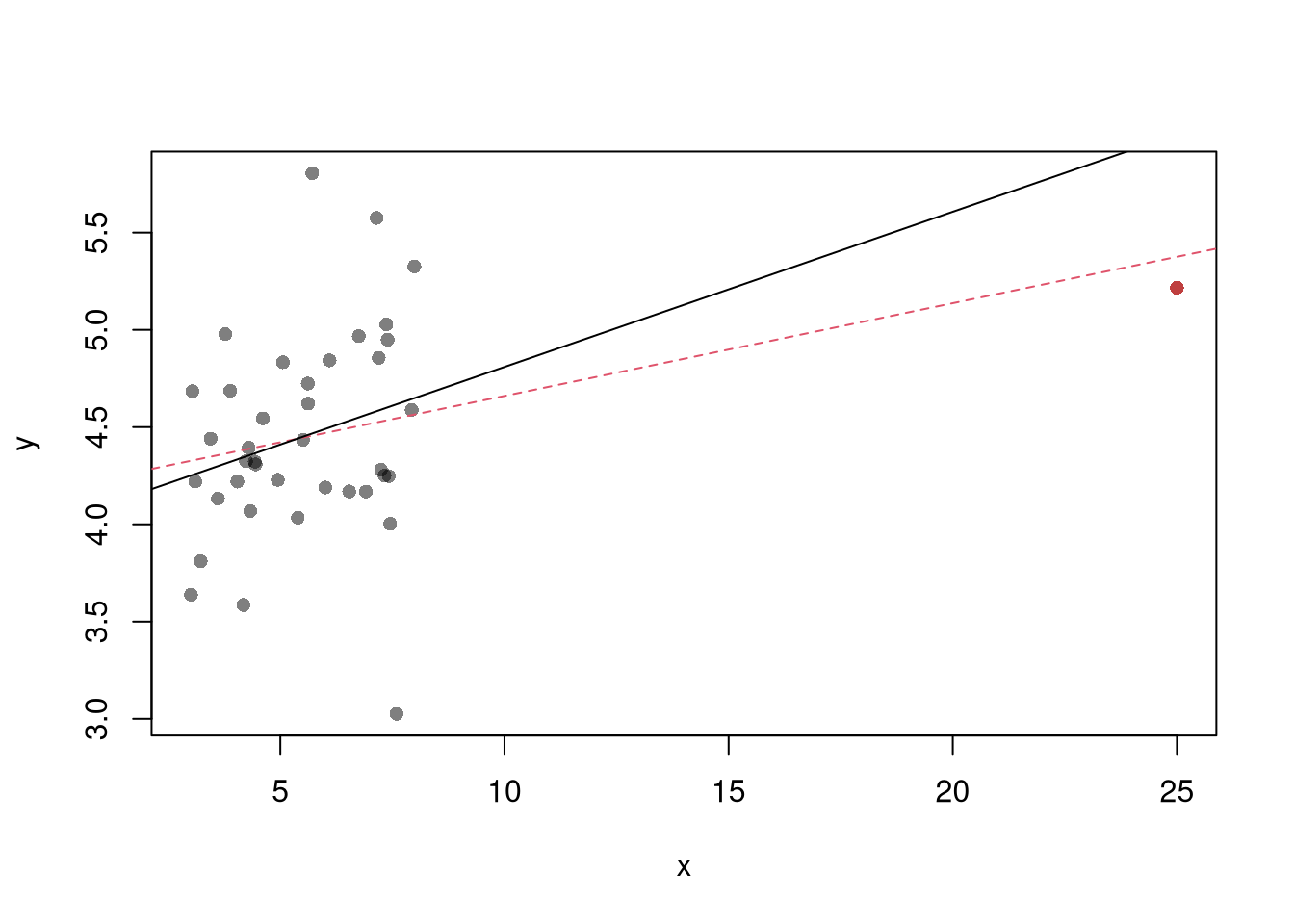 The third diagnostic plot examines another type of outlier, the observed explanatory variable \(\hat{X}_{i}\) is far from the others. A point has high leverage if the estimates change dramatically when you estimate the model without that data point.