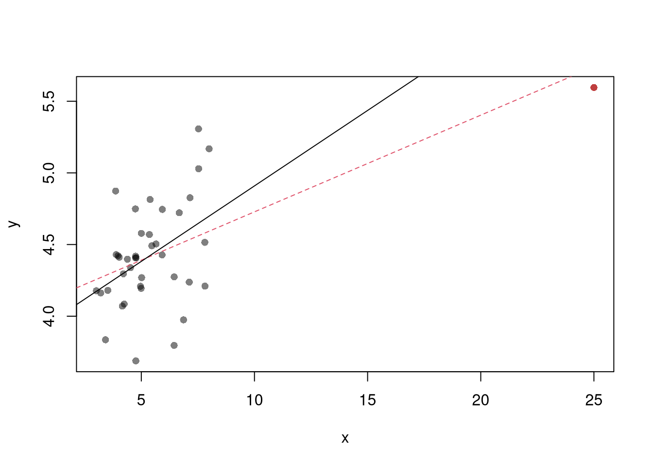 The third diagnostic plot examines another type of outlier, the observed explanatory variable \(\hat{X}_{i}\) is far from the others. A point has high leverage if the estimates change dramatically when you estimate the model without that data point.