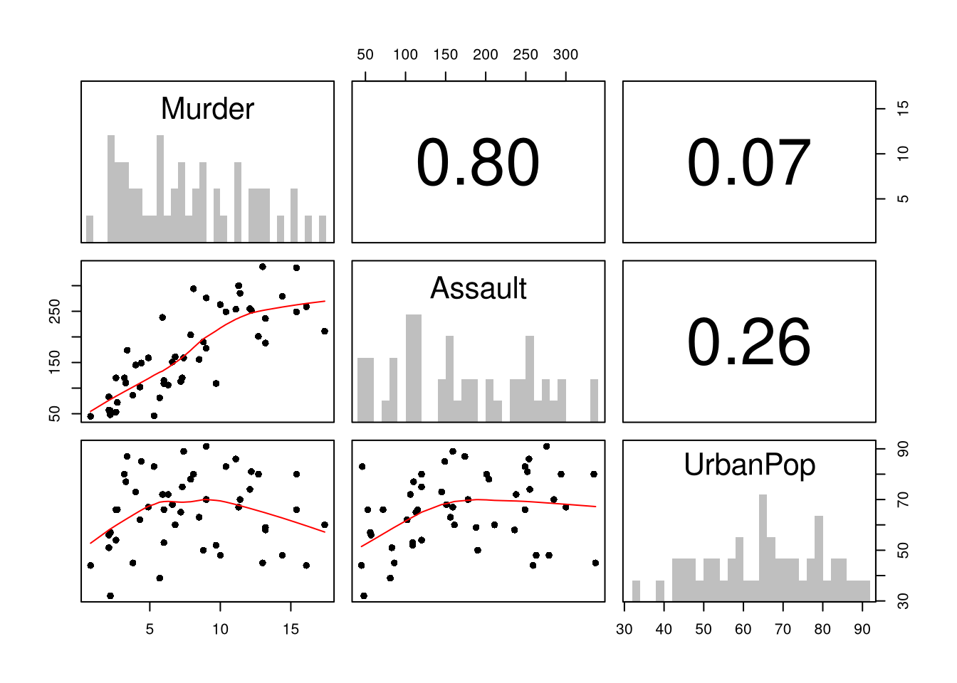 # Inspect Dataset on police arrests for the USA in 1973head(USArrests)## Murder Assault UrbanPop Rape## Alabama 13.2 236 58 21.2## Alaska 10.0 263 48 44.5## Arizona 8.1 294 80 31.0## Arkansas 8.8 190 50 19.5## California 9.0 276 91 40.6## Colorado 7.9 204 78 38.7library(psych)pairs.panels( USArrests[,c('Murder','Assault','UrbanPop')],hist.col=grey(0,.25), breaks=30, density=F, hist.border=NA, # Diagonalellipses=F, rug=F, smoother=F, pch=16, col='red'# Lower Triangle )