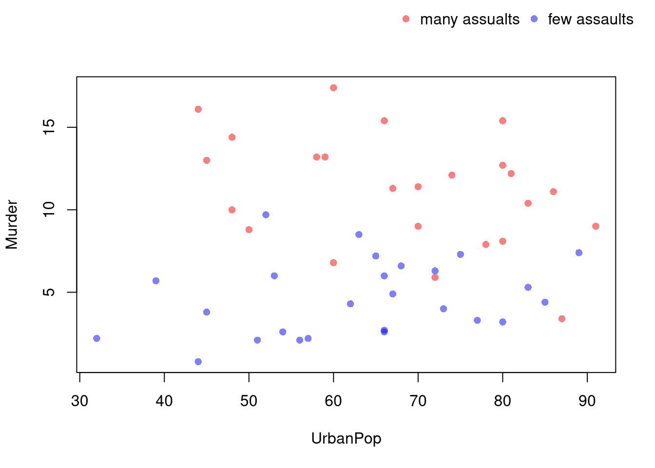 # High Assault Areasassault_high <- USArrests$Assault >median(USArrests$Assault)col_high <-rgb(1,0,0,.5)col_low <-rgb(0,0,1,.5)cols <-ifelse(assault_high, col_high, col_low)# Scatterplot# Show High Assault Areas via 'cex=' or 'pch='# Could further add regression lines for each data splitplot(Murder~UrbanPop, USArrests, pch=16, col=cols)outer_legend <-function(...) { opar <-par(fig=c(0, 1, 0, 1), oma=c(0, 0, 0, 0), mar=c(0, 0, 0, 0), new=TRUE)on.exit(par(opar))plot(0, 0, type='n', bty='n', xaxt='n', yaxt='n')legend(...)}outer_legend('topright',legend=c('many assualts', 'few assaults'),pch=16, col=c(col_high, col_low),horiz=T, cex=1, bty='n')