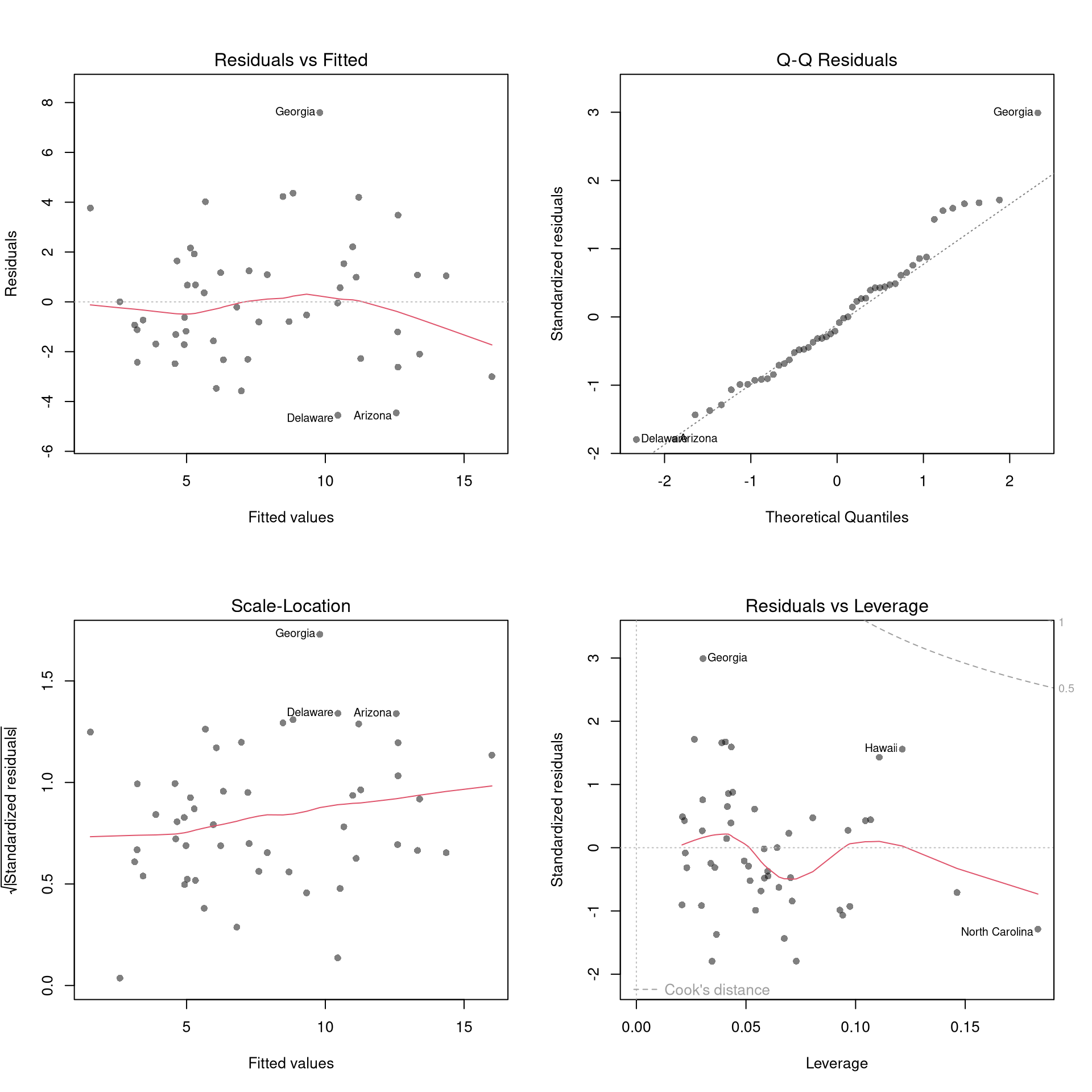There’s little sense in getting great standard errors for a terrible model. Plotting your regression object a simple and easy step to help diagnose whether your model is in some way bad. We next go through what each of these figures show.